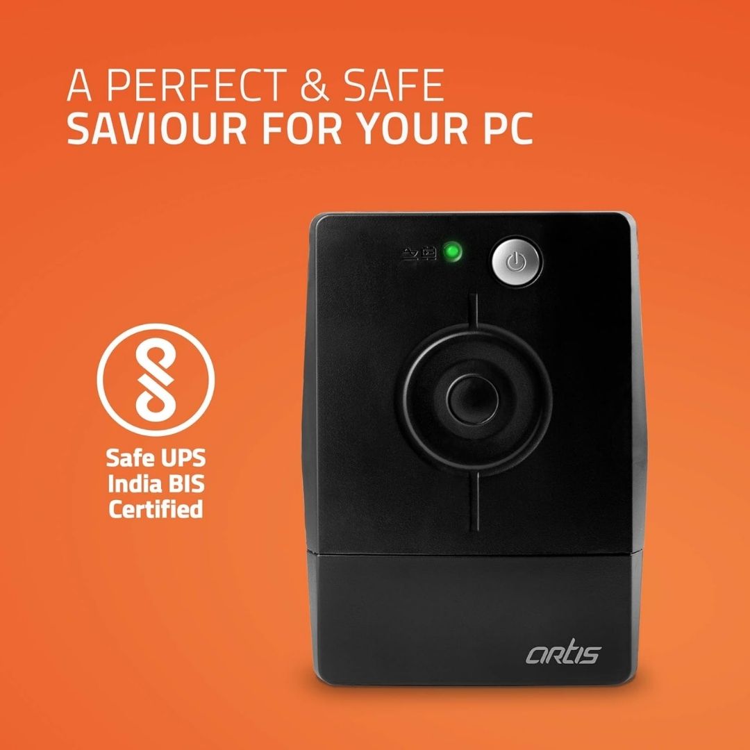 The Artis PS-600VA Line Interactive UPS delivers reliable power backup for desktops, routers, and home office devices. Featuring advanced microcontroller technology, a wide input range (140–300V), and automatic voltage regulation (AVR), this UPS ensures smooth operation during power fluctuations. Its LCD display provides real-time information on input/output voltage, battery level, and load status. With a backup time of up to 40 minutes (depending on load) and cold start capability, it’s a dependable choice for stable performance and protection.