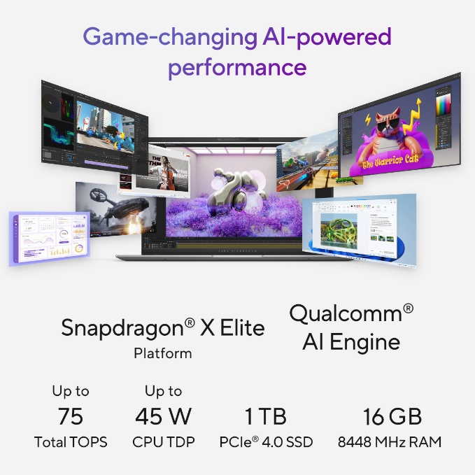 Processor | Snapdragon® X Elite X1E 78 100 Processor 3.4GHz (42MB Cache, up to 3.4GHz, 12 cores, 12 Threads) || Qualcomm® AI Engine up to 75 total TOPs | ||||||||||||||||||||