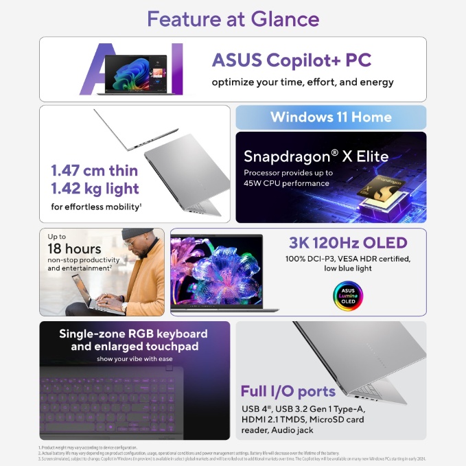 Meet your first ASUS Copilot+ PC — the ASUS Vivobook S 15, a sleek AI-powered laptop designed for smart users. With the efficient power of its Snapdragon® X Elite Processor, enjoy seamless productivity. The 3K 120 Hz ultra-large OLED display and immersive audio system are encased in a premium all-metal 1.47 cm-thin, 1.42 kg-light1 body for effortless mobility. Featuring a mood-setting single-zone RGB keyboard, with a dedicated Copilot key for instant AI assistance, revolutionize your work and play. Welcome to an innovative and elegant future, where AI brings you to the forefront, with no compromises.