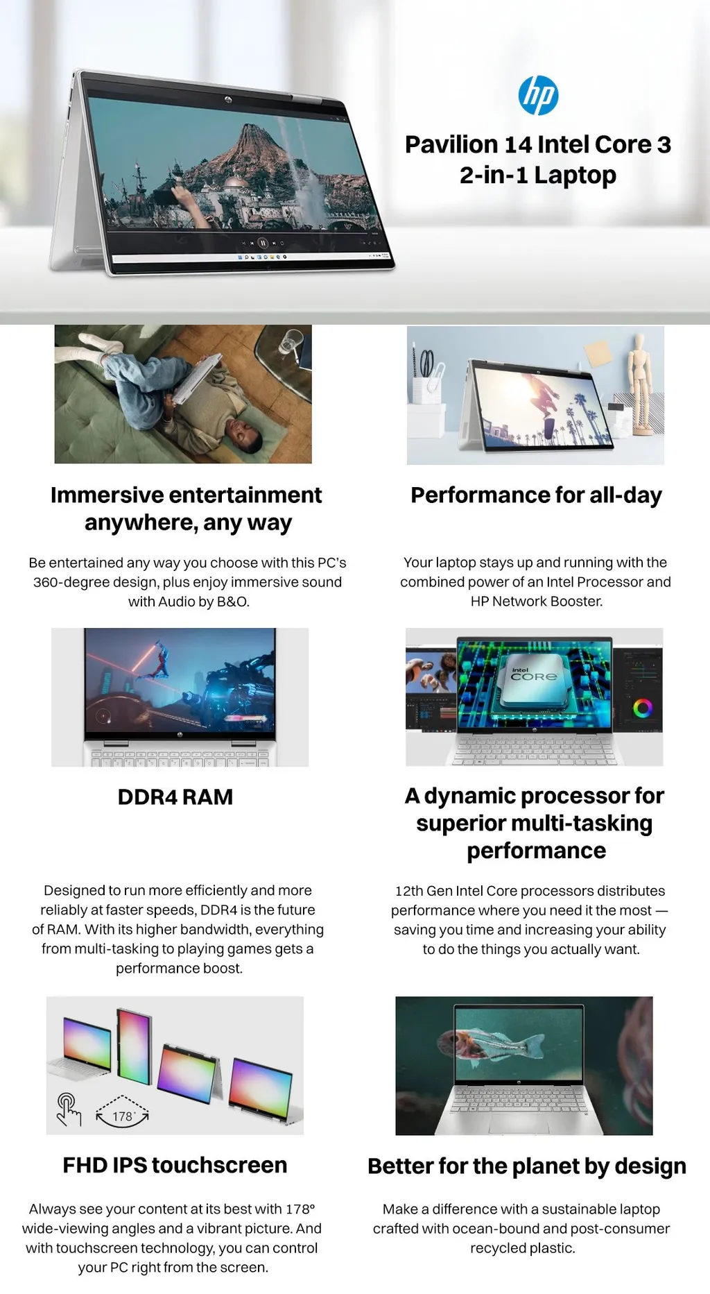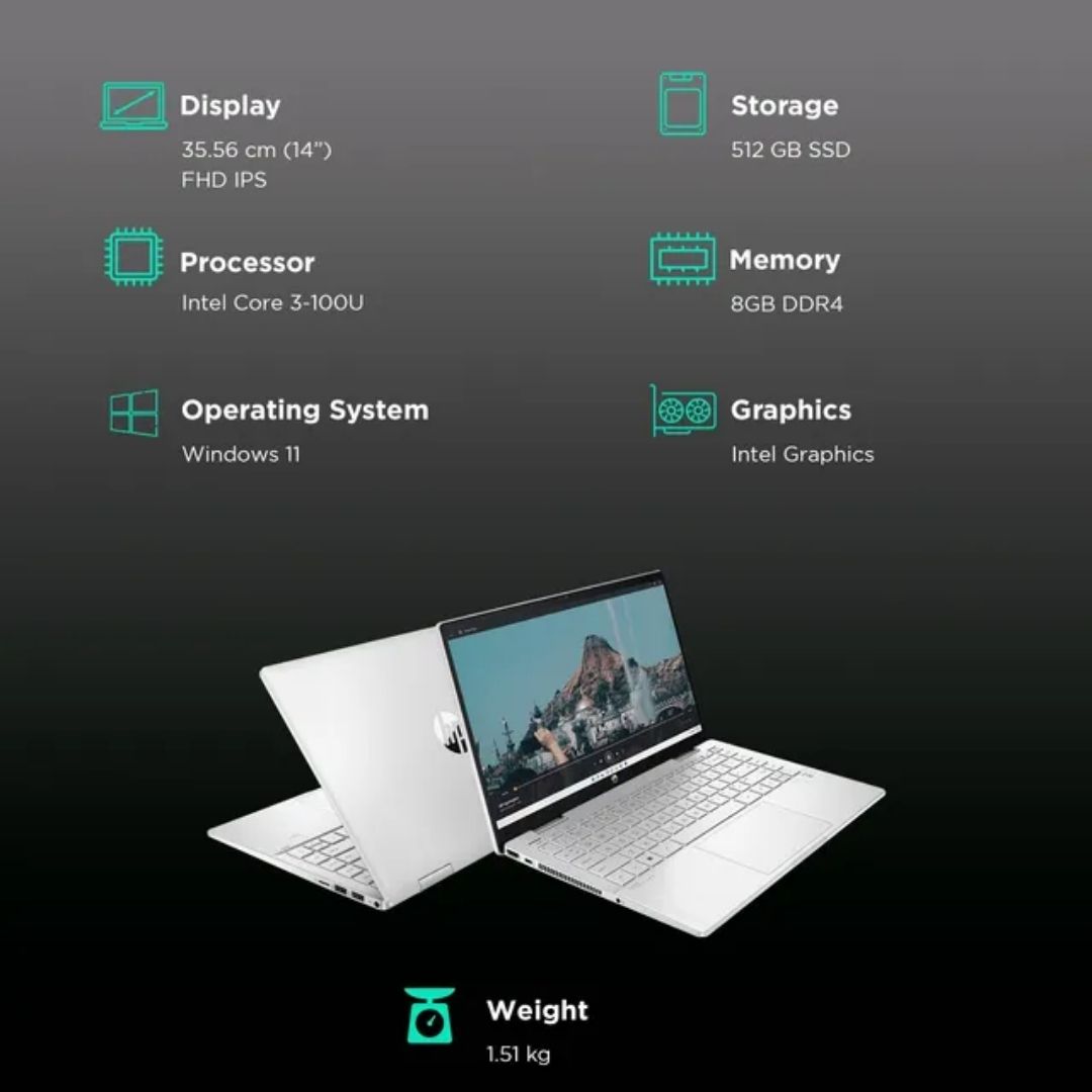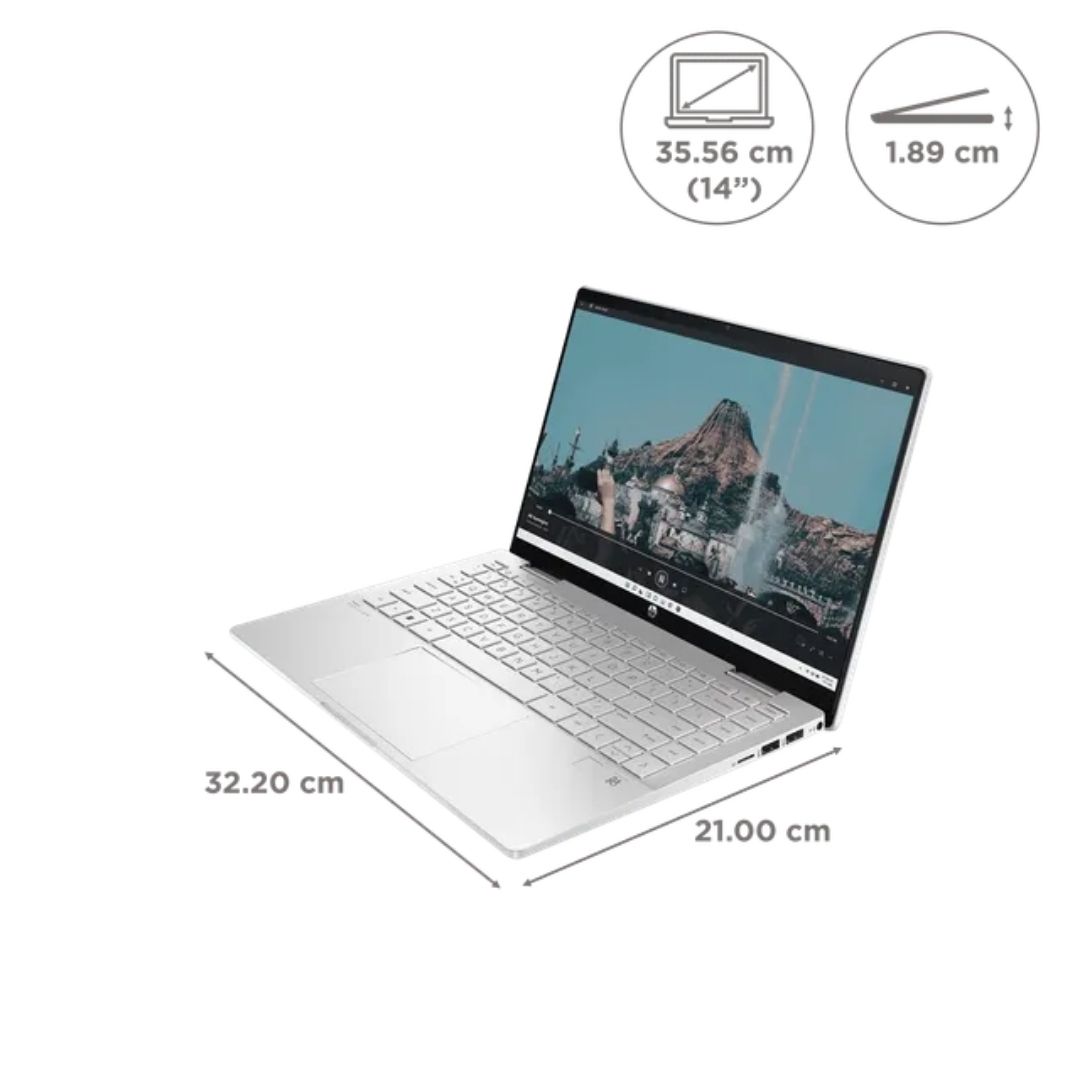 The HP Pavilion 14-ek2033TU is a stylish and versatile 2-in-1 touchscreen laptop designed for students, professionals, and everyday users who want flexibility and performance. Powered by the Intel Core 3 100U processor, it handles daily multitasking with ease. The 14-inch Full HD IPS touchscreen provides vibrant visuals and allows seamless use in laptop, stand, tent, or tablet mode.