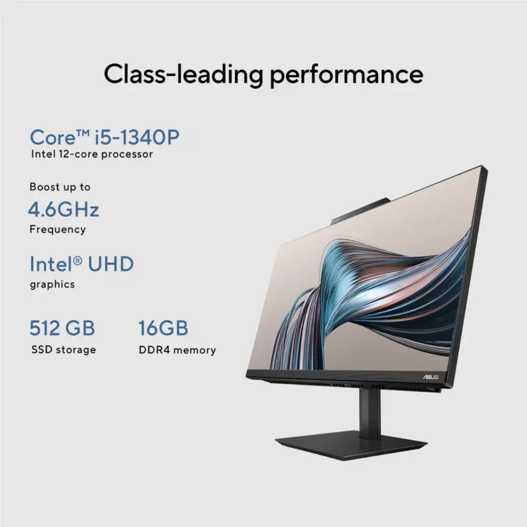 The ASUS AiO A5 Series is an elegant and powerful all-in-one desktop designed to simplify and elevate your workspace. Powered by the 13th Gen Intel Core i5-1340P processor and equipped with 16GB DDR4 RAM and 512GB SSD, it delivers fast, smooth, and efficient performance for multitasking, office work, and entertainment.