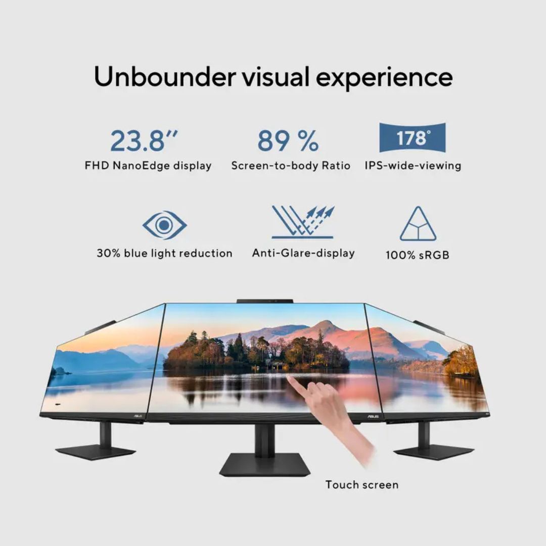 Its 23.8-inch Full HD touchscreen provides a vibrant, immersive visual experience with intuitive touch control. The sleek and space-saving all-in-one design eliminates cable clutter, offering a clean, modern setup perfect for homes and offices alike.