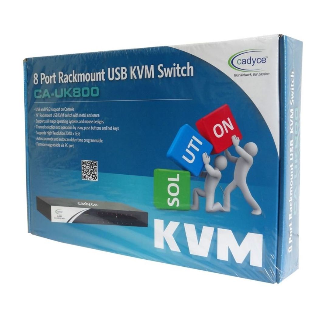 The Cadyce CA-UK800 8-Port USB KVM Switch is a high-performance solution for managing up to eight computers from a single keyboard, mouse, and VGA monitor. Engineered with a durable metal chassis and rackmount design, it’s ideal for professional IT setups, server rooms, and multi-system management environments. With hotkey and push-button switching, users can easily toggle between systems while maintaining smooth, stable operation. Supporting resolutions up to 2048×1536, it ensures superior visual clarity. The CA-UK800 includes LED indicators for instant port identification and features plug-and-play functionality with no driver requirement.