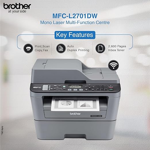 Brother MFC-L2701DW Multi-Function Monochrome Laser Printer is an all-in-one device that combines print, scan, copy, and fax functionalities, designed to meet the needs of home offices and small businesses. With auto duplex printing, it efficiently prints double-sided documents, reducing paper usage and cutting costs. The printer supports Wi-Fi connectivity, allowing for convenient wireless printing from multiple devices, including smartphones and tablets. With a fast print speed of up to 30 pages per minute (PPM), this monochrome printer delivers sharp,