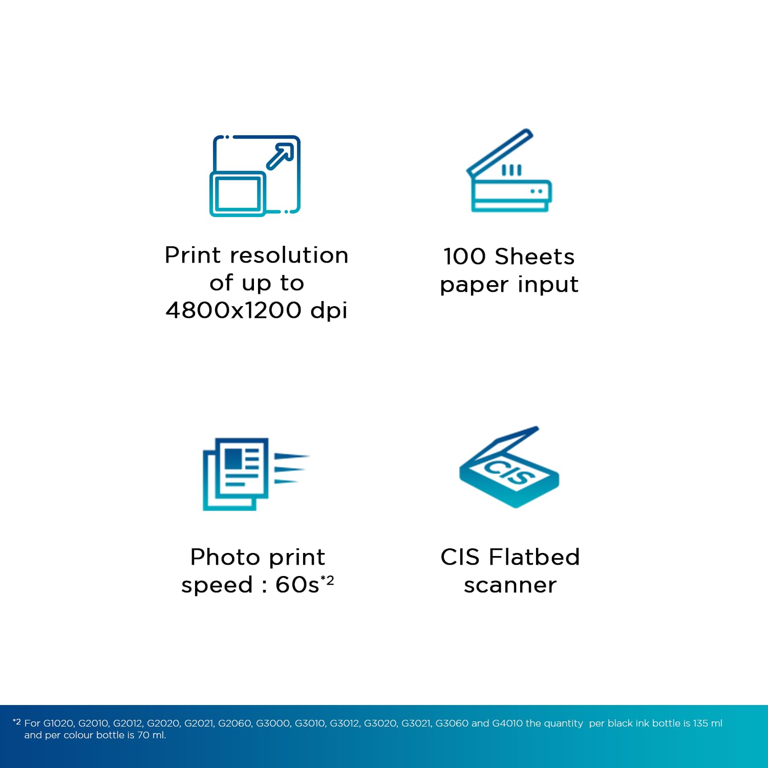 The Canon PIXMA MegaTank G2012 is an all-in-one ink tank printer designed for high-volume, low-cost printing at home or in a small office. It offers print, scan and copy functions with USB connectivity for stable and reliable performance. With a maximum resolution of 4800 x 1200 dpi, it delivers sharp documents and vibrant colour prints.
