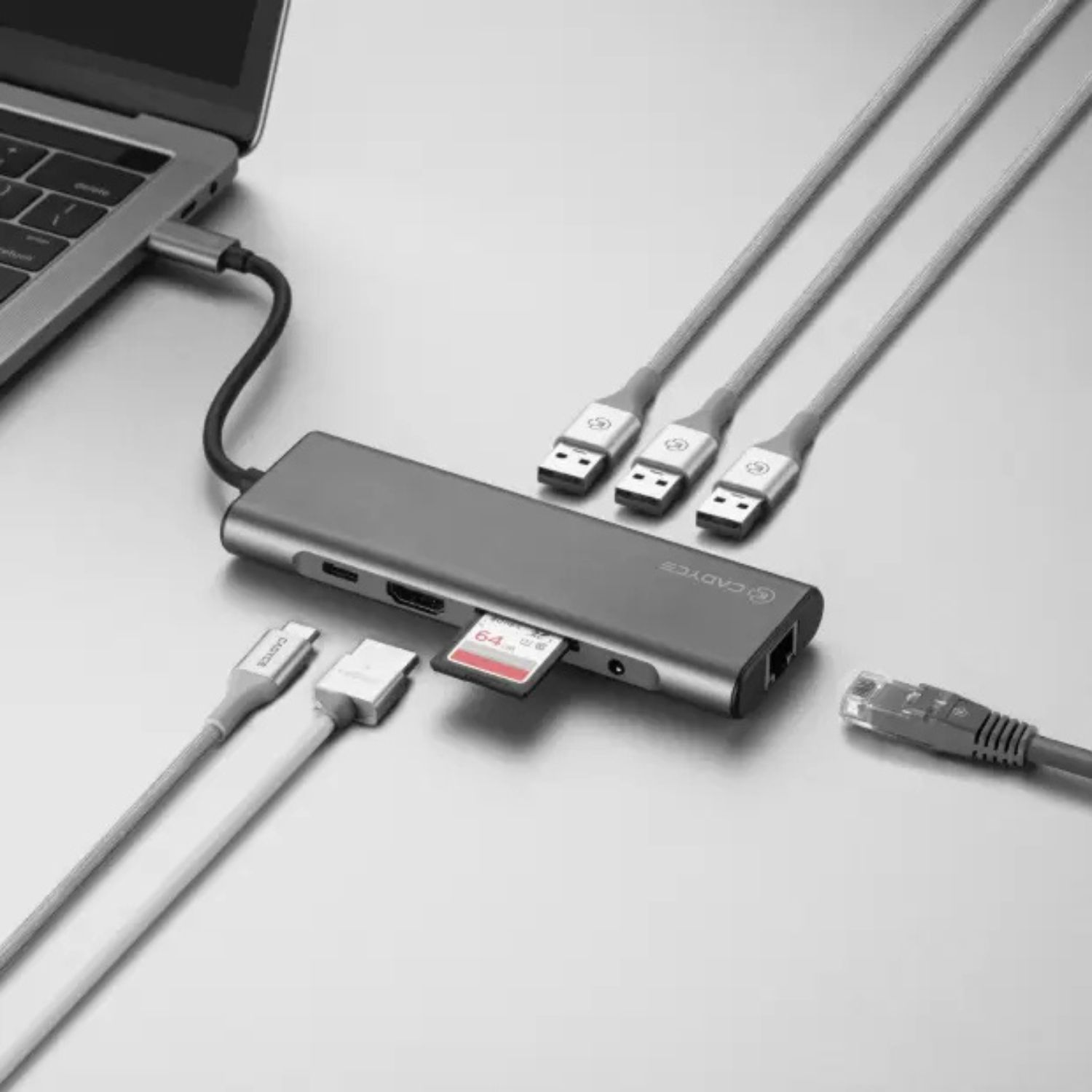 Cadyce CA-CXTDS Type-C Travelling Dock with Audio is a premium 8-in-1 USB-C hub built for professionals who need full desktop connectivity anywhere. It expands your USB-C / Thunderbolt 3 laptop with HDMI, Ethernet, SD and microSD card slots, three USB 3.0 ports, 3.5 mm audio jack, and USB-C PD charging up to 100 W.