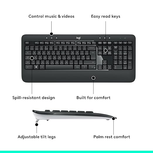 The Logitech MK540 Advanced Wireless Keyboard and Mouse Combo is a reliable and comfortable set designed for productivity. The full-size keyboard comes with a familiar layout, palm rest, quiet keys, and convenient multimedia hotkeys, making typing smooth and efficient. It is spill-resistant, durable, and offers up to 3 years of battery life. The included wireless mouse features an ambidextrous design with soft rubber grips, smooth optical tracking, and an 18-month battery life. Both devices connect through a single 2.4 GHz Logitech Unifying USB receiver, providing a stable wireless range of up to 10 meters. Perfect for Windows PCs and laptops, this combo delivers long-lasting comfort, reliable performance, and hassle-free setup.
