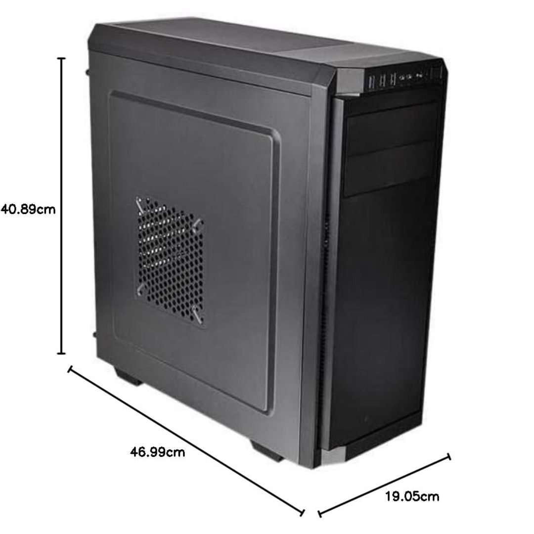 Sleek Mid-Tower Design: Durable steel body with a modern black finish.