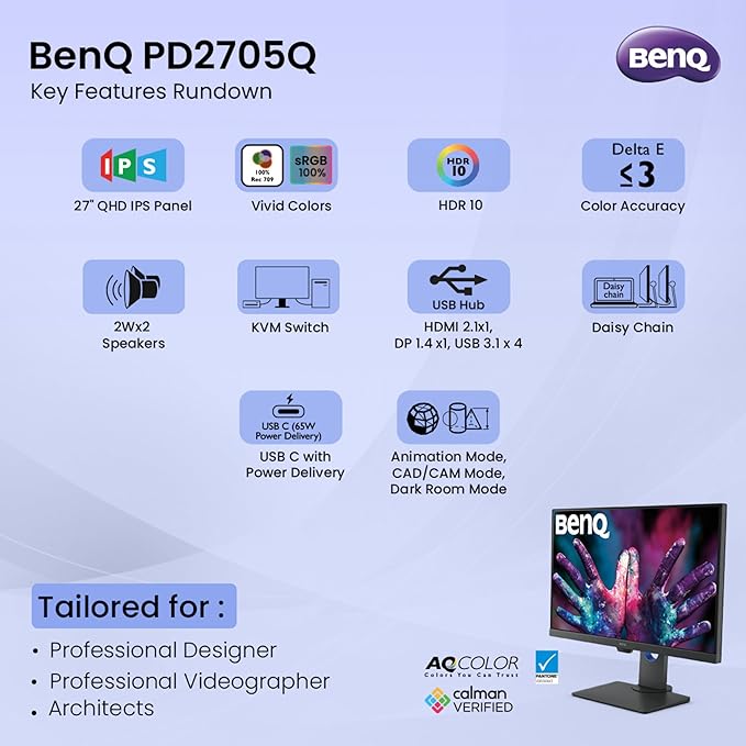 The BenQ PD2705Q is a 27-inch QHD (2560x1440) IPS monitor designed for graphic designers and professionals, featuring HDR10 support and exceptional color accuracy with 100% sRGB and Rec.709 coverage. It includes specialized modes like Darkroom, CAD/CAM, and Animation for tailored viewing experiences. Connectivity options include HDMI, DisplayPort, USB-C (with 65W power delivery), and daisy chain support for an organized workspace. The monitor is Calman Verified and Pantone Validated, ensuring reliable color performance. With ergonomic features like auto pivot and a height-adjustable stand, the PD2705Q enhances productivity while providing eye care technology to reduce strain.