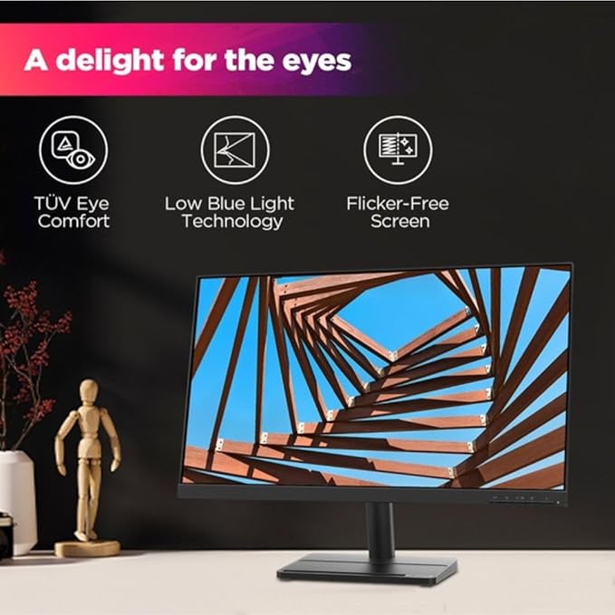 The Lenovo L27E-30 is a 27-inch FHD IPS monitor designed for vibrant visuals and smooth performance. It features a 75Hz refresh rate, 4ms response time, and AMD FreeSync for fluid gameplay. With 16.7 million colors, 72% NTSC coverage, and a 250-nit anti-glare display, it offers an excellent viewing experience. Eye comfort is ensured with TÜV Rheinland certification and Low Blue Light technology. The monitor includes HDMI and VGA connectivity, supports VESA mounting, and comes with a tilt stand. It is backed by a 3-year onsite warranty, making it a reliable choice for work and entertainment.