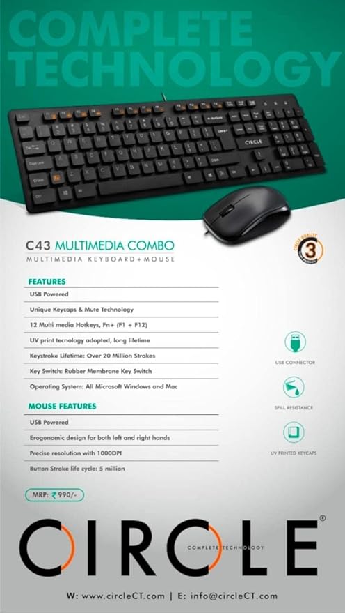 The ergonomic wired mouse provides smooth and accurate tracking, making it ideal for daily tasks. The 3-year warranty ensures peace of mind, making the Circle C43 Slim Multimedia Combo a reliable choice for everyday computing needs.