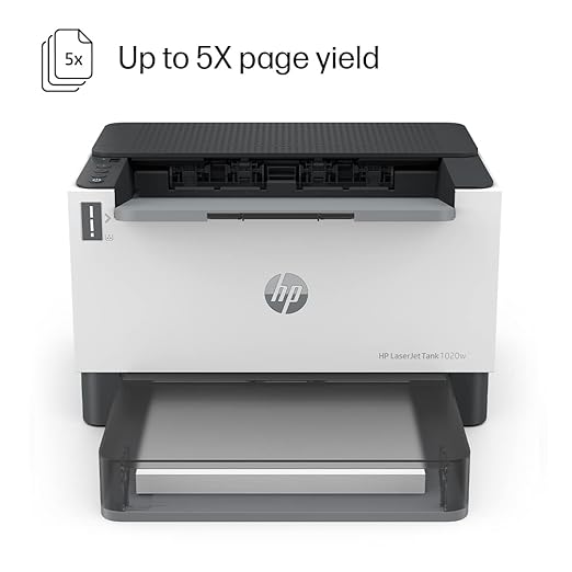 Enhance your printing efficiency with the HP LaserJet Tank 1020w Printer. This wireless black and white printer delivers high-speed printing at up to 22 pages per minute, making it ideal for both home and small office use. Equipped with a 150-sheet input tray and a 100-sheet output tray, it ensures smooth handling of your documents. With a robust duty cycle of 25,000 pages, you can count on its reliability for your printing needs. Connect effortlessly via Hi-Speed USB 2.0 or Bluetooth LE. Model 381V6A.