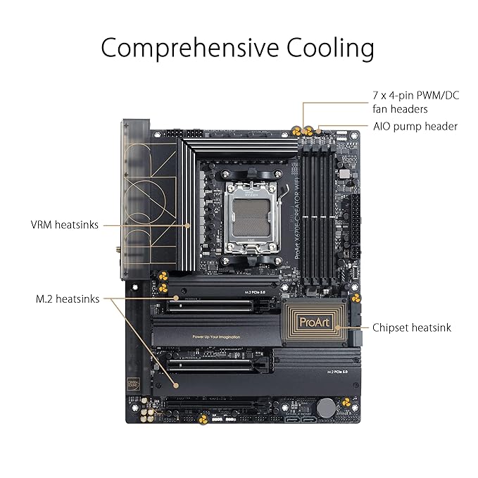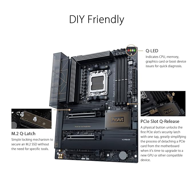 PCIe 5.0 supportFully embracing the new standard, the ProArt X670E-Creator WiFi offers PCIe 5.0 support to give unfettered bandwidth to the fastest SSDs and graphics cards available. Four onboard M.2 slots The ProArt X670E-Creator WiFi features four onboard M.2 slots, two of which are PCIe 5.0-ready to offer blistering 16 GB/s speed, while the remaining pair can still deliver massive 8 GB/s transfers through their PCIe 4.0 interfaces. |