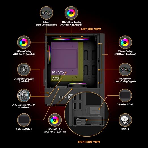 Circle Elegantor X5 ARGB Case is a sleek and stylish mid-tower PC case designed to elevate your gaming and PC building experience. With its tempered glass front and right panels, this case offers a clean, modern aesthetic that lets you show off your components and dynamic RGB lighting. Pre-installed with 4 x 120mm ARGB fans, it delivers exceptional airflow and vibrant lighting effects for your system.