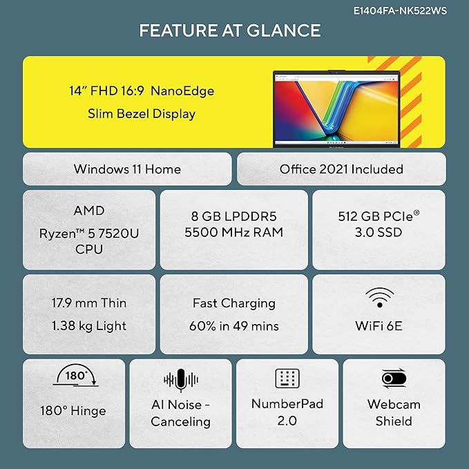 With 8GB DDR5 RAM and a 512GB SSD, this laptop offers fast boot-up times, seamless app switching, and ample storage space. The 14-inch Full HD anti-glare display delivers crisp and immersive visuals while being easy on the eyes during extended use.