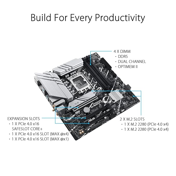 - PRIME B760M-A WIFI is equipped with outstanding features, including 10 power stages, 6-layer PCB design, DDR5 7200+ (OC)*, PCIe 4.0 support, two M.2 slots, Realtek 2.5Gb Ethernet, Wi-Fi 6, rear USB 3.2 Gen 2 ports, front USB 3.2 Gen 1 Type-C®, DisplayPort/Dual HDMI™, Addressable Gen 2 headers, Aura RGB header, Aura Sync, Q-LED Core, ASUS OptiMem II, AEMP II, MyASUS, Fan Xpert 2+, Power Saving, Armoury Crate, ASUS 5X PROTECTION III, SafeSlot Core+