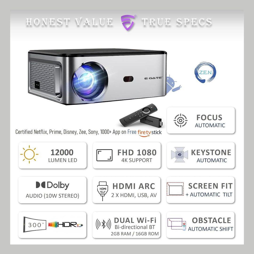 The EGate O9 Pro-Zen Smart Projector is a powerful home entertainment solution built for seamless streaming and immersive visuals. Featuring a Dual OS system (Android + FTS), it ensures stable performance while delivering certified access to Netflix, Prime Video, Hotstar, and other popular OTT platforms.