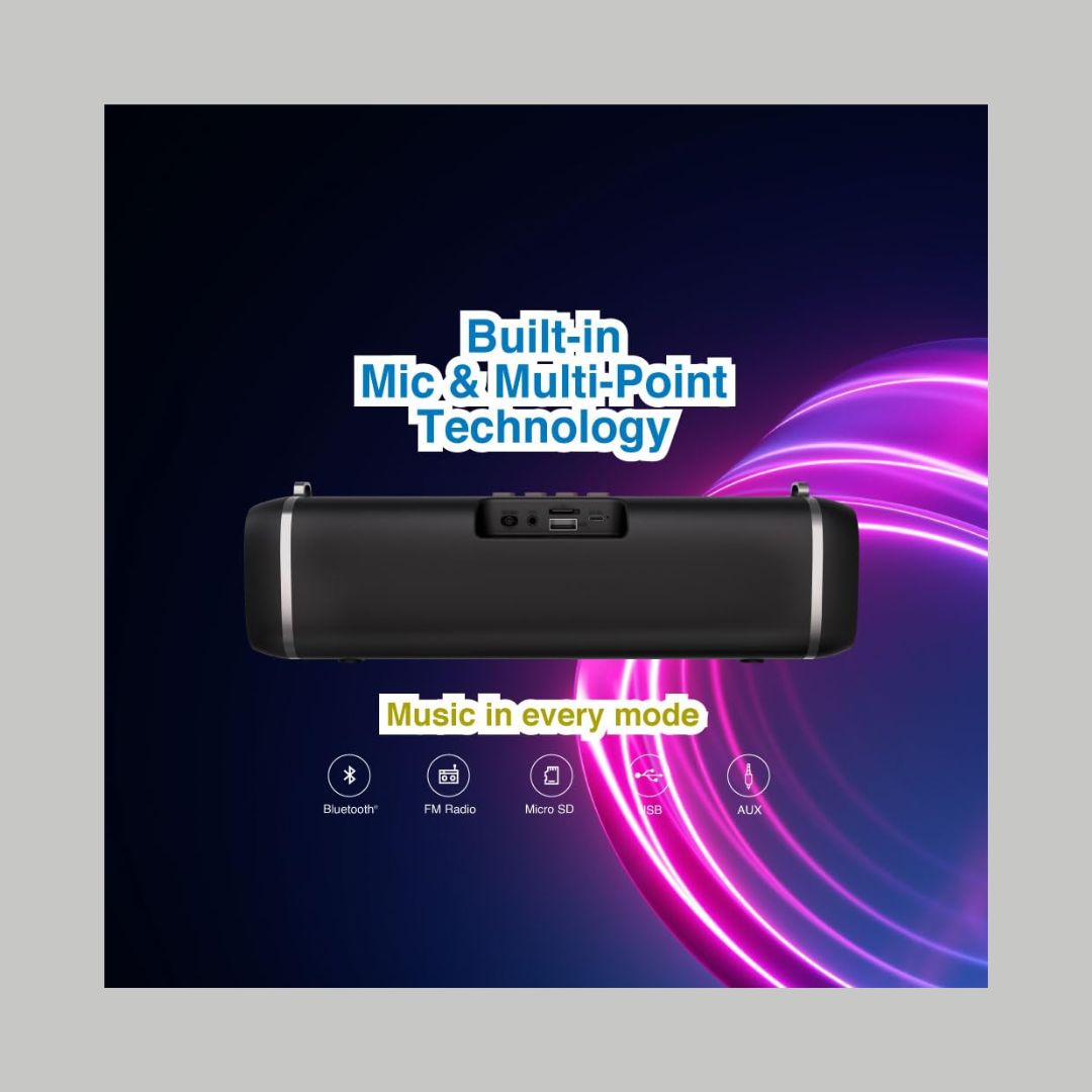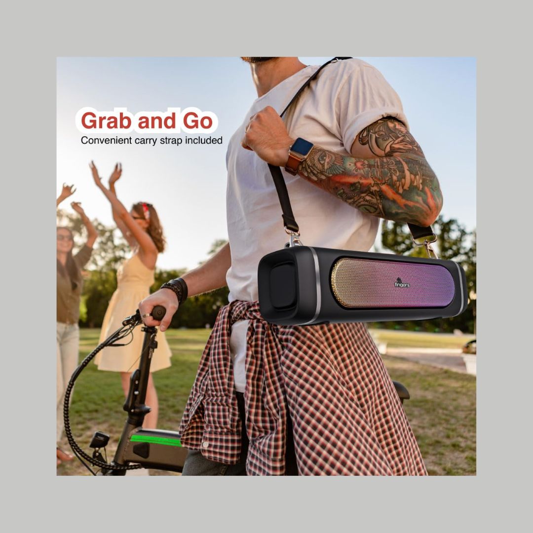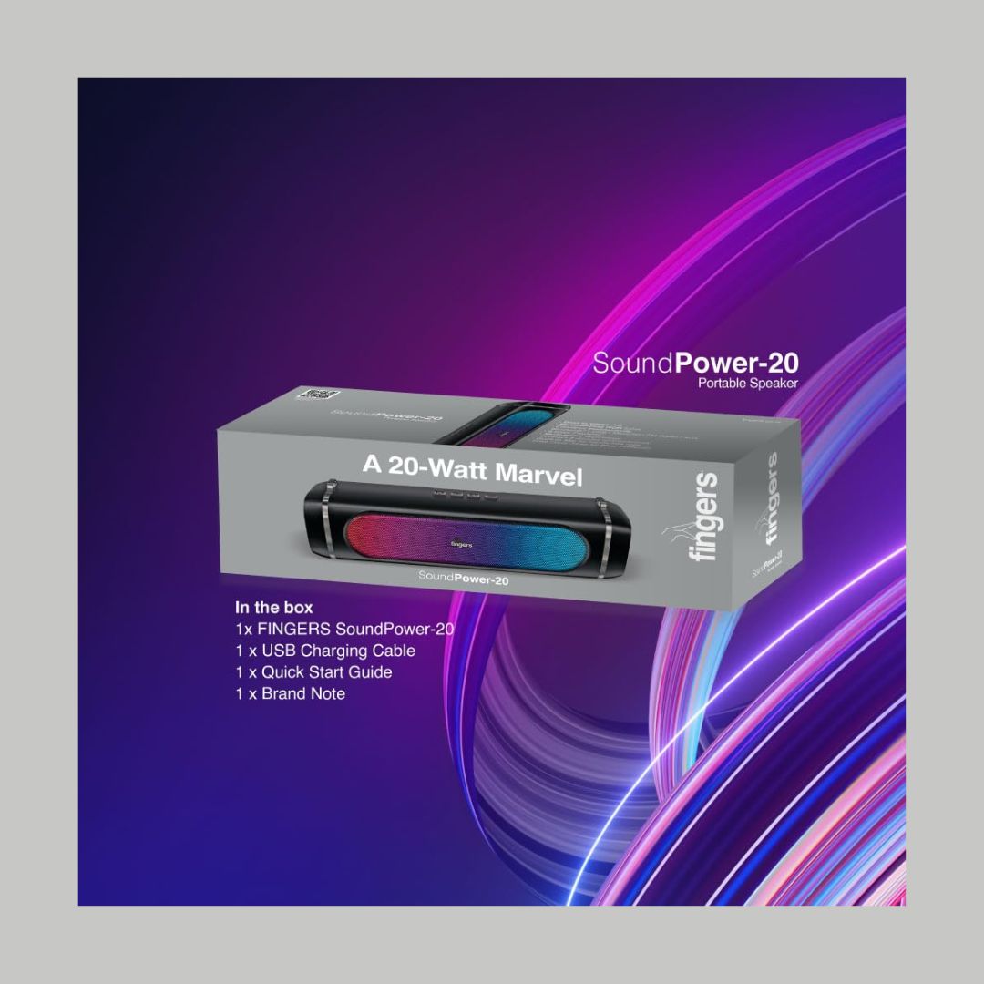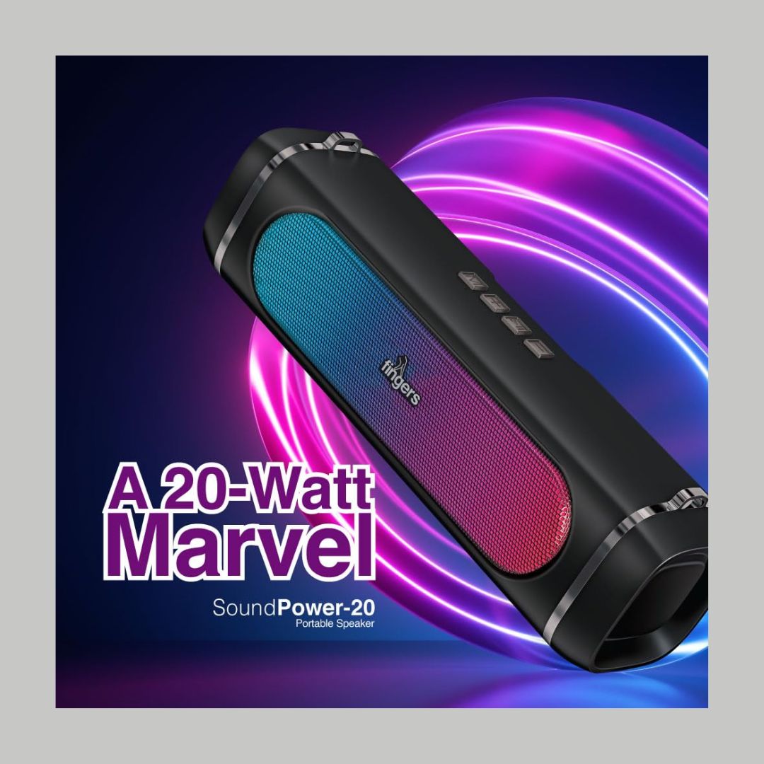The FINGERS SoundPower-20 is a sleek and portable Bluetooth speaker offering an immersive 20W deep bass experience with dual full-range drivers. Featuring RGB lights with 10 dynamic effects synchronized to your music, it enhances any setting with a lively ambiance. Powered by a 3000mAh battery, it delivers up to 9 hours of non-stop playback and supports versatile playback modes, including Bluetooth, FM Radio, USB, AUX, and MicroSD. With its built-in microphone for clear calls and multi-point connectivity for two devices, it's perfect for any occasion. Lightweight and travel-friendly, it includes a carry strap for easy portability.