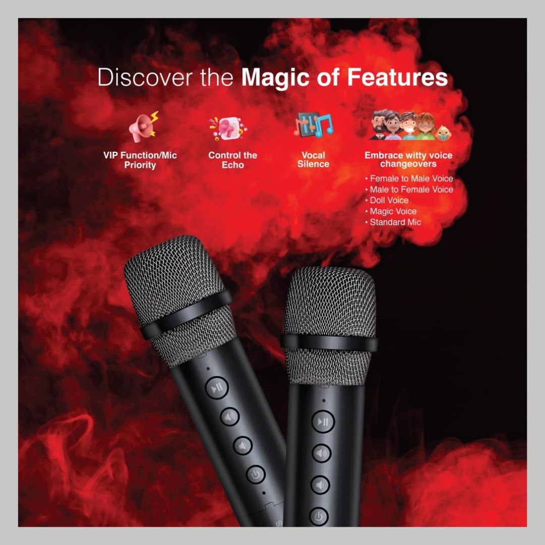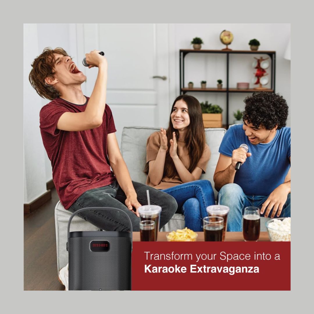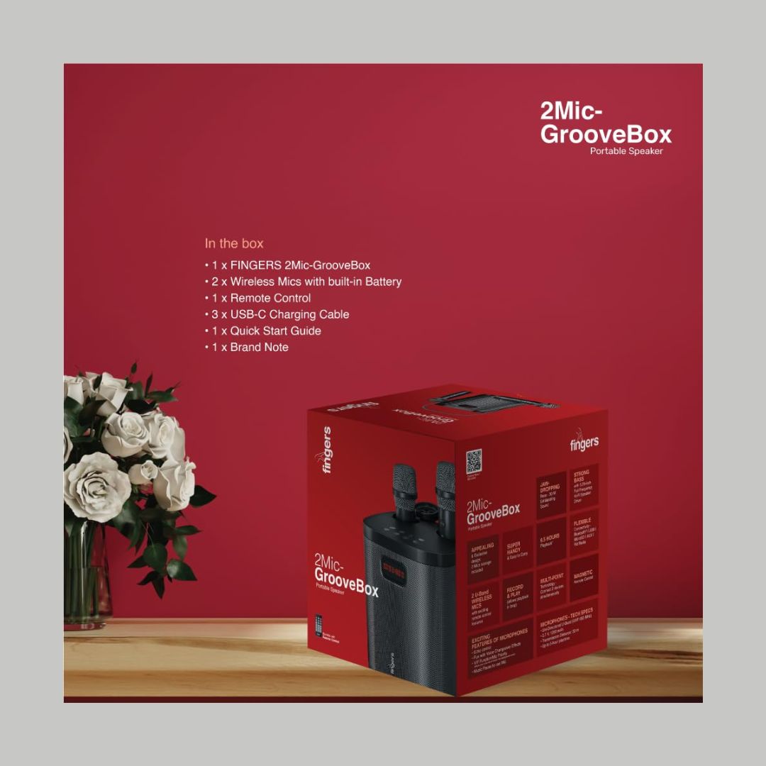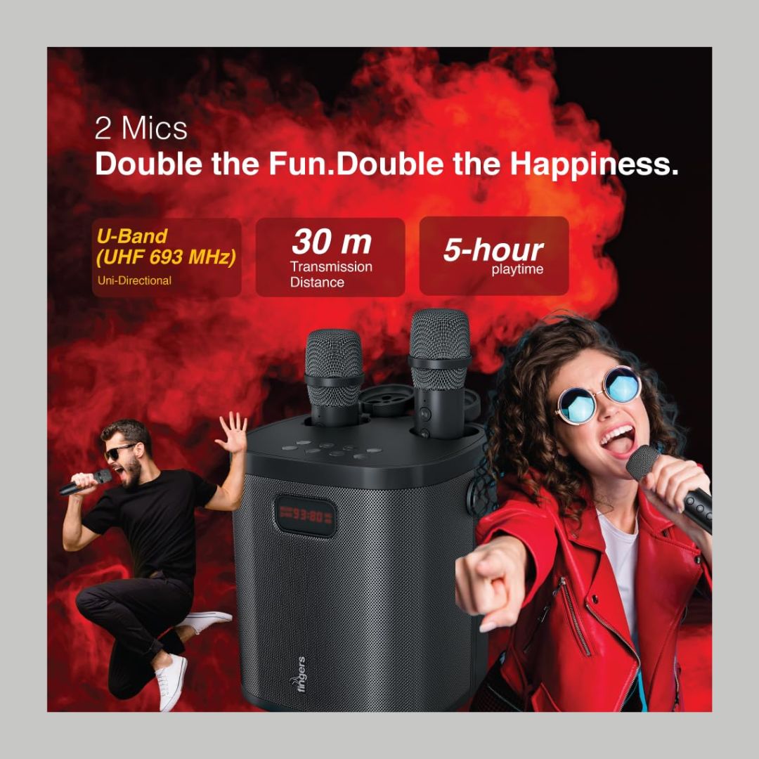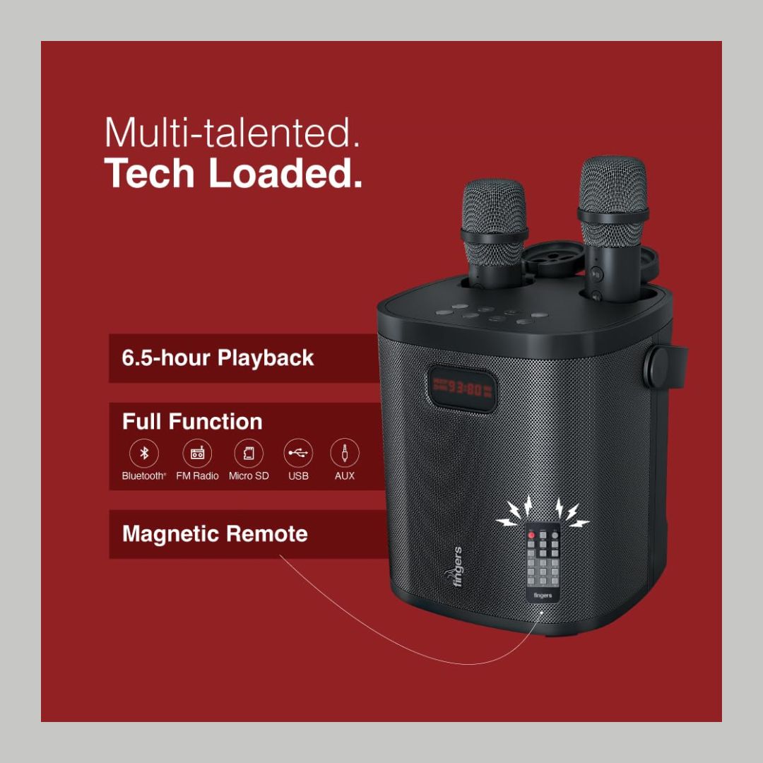 Turn any space into a party zone with the FINGERS 2Mic-GrooveBox Portable Speaker. Designed for high-energy entertainment, it delivers 20W powerful sound with intense bass, ensuring loud and clear audio for music, karaoke, and announcements.