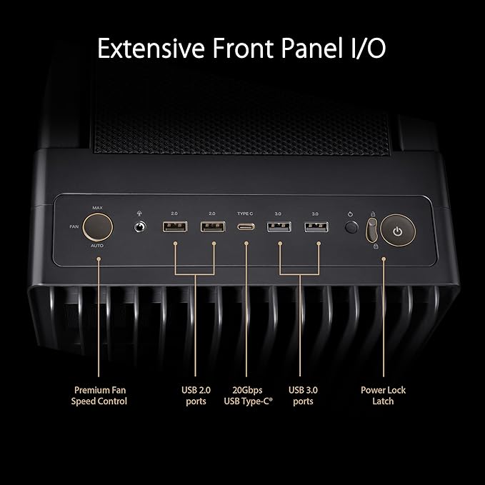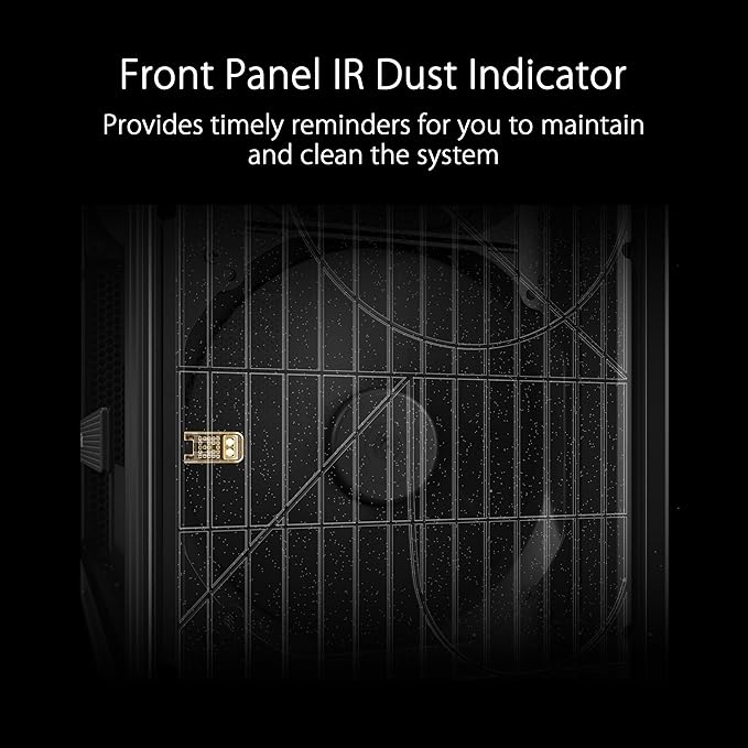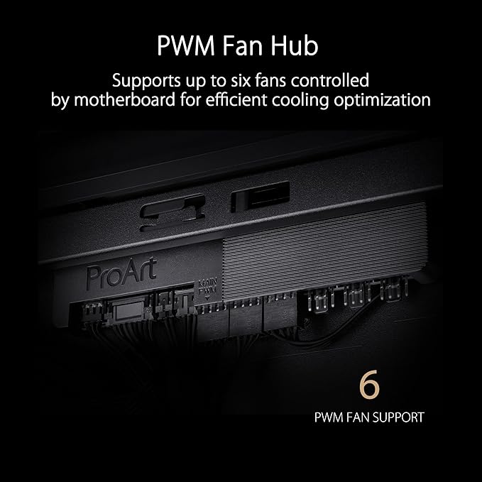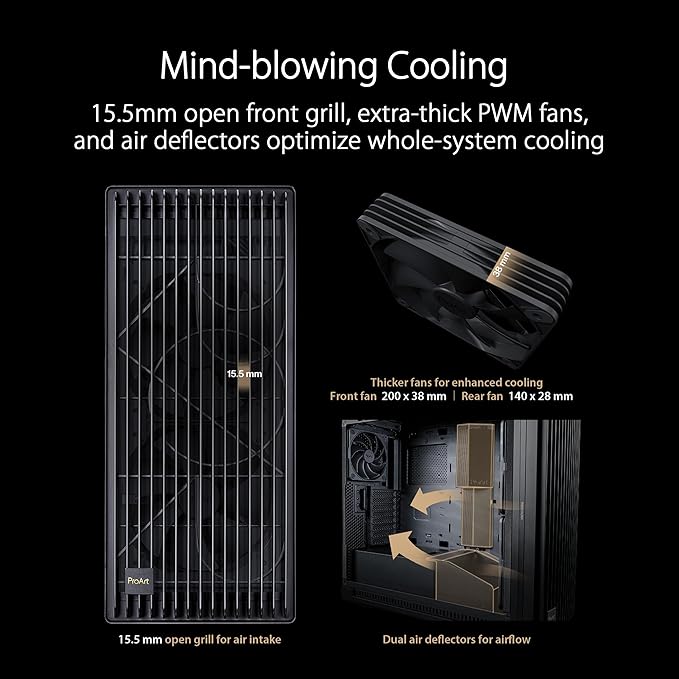 ProArt PA602 E-ATX computer case, 420 mm radiator support, one 140 mm and two 200mm pre-installed system fans, front panel IR dust indicator, power lock latch, tool-less PCIe mounting, USB 20Gbps support