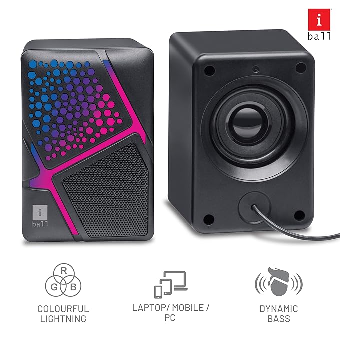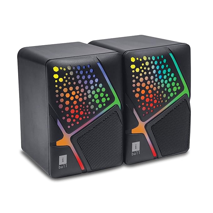 iBall Disco 18 RGB Speaker: 2.0 USB-powered gaming multimedia speaker with 6W RMS stereo sound and dynamic bass. Features vibrant RGB LED lights for an immersive experience and a 3.5mm aux input for easy connectivity to laptops, PCs, and smartphones. Includes a volume control for convenient sound adjustment. Perfect for gaming and parties.