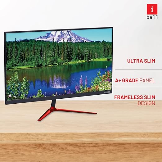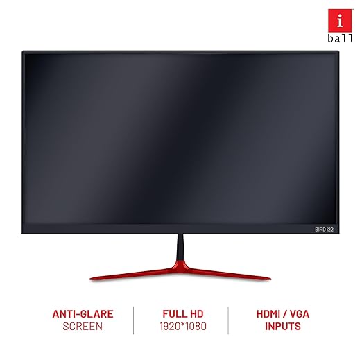 iBall Bird i22 LED Monitor: This 21.45" widescreen monitor features a frameless ultra-slim design with a full HD resolution of 1920x1080 pixels and a 75Hz refresh rate, providing smooth visuals. With an A+ grade panel, it offers a brightness range of 200-250 cd/m² and a dynamic contrast ratio of 500,000:1. The monitor is wall-mountable (4-hole design) and includes a metallic stand that tilts (+15° forward, -5° backward). Equipped with HDMI and VGA inputs, it is suitable for both home and office use, including CCTV compatibility. Power consumption is efficient at 12V/2.5A DC, and it comes bundled with an HDMI cable and DC adapter for instant setup. The monitor dimensions are 14.2 x 49.4 x 37.1 cm, weighs 2.9 kg, and is supported by a 3-year warranty.