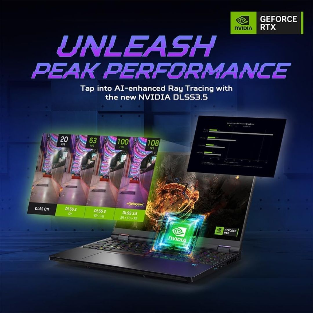 Discover peak gaming visuals with the GeForce RTX 40 Series Graphics. Immerse yourself in vivid detail and unmatched efficiency, boosted by DLSS 3 technology. Tap into AIenhanced breakthroughs for a seamless, captivating gaming journey that commands your full attention.