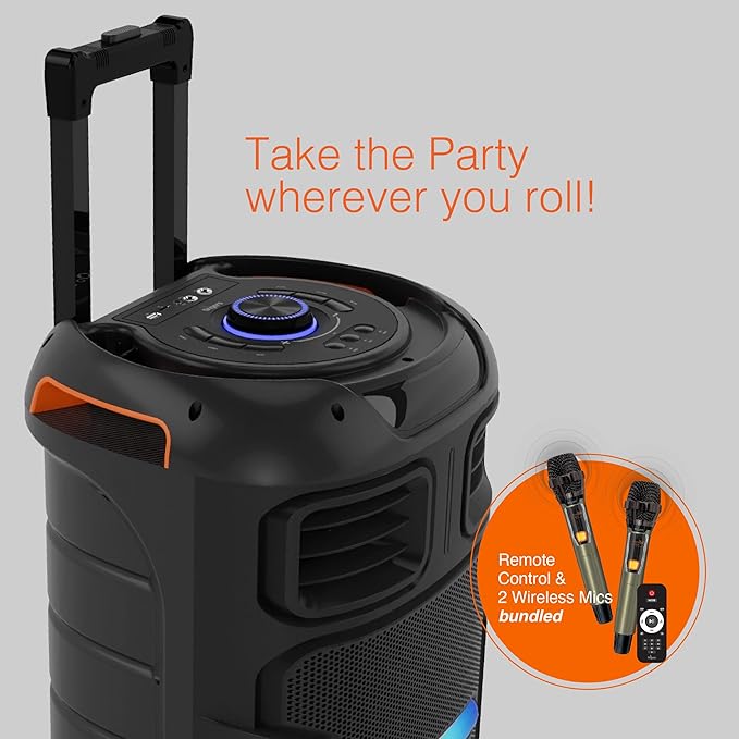 Designed for ultimate entertainment, this speaker comes with two wireless microphones and also supports two additional wired mics, making it perfect for karaoke nights, stage performances, announcements, and events. The vibrant RGB lighting adds energy to your music, while the trolley-style wheels and handle ensure easy portability.