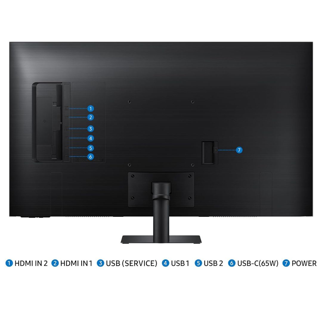 Equipped with Wi-Fi, Bluetooth, built-in speakers, and an eco-friendly Solar Remote, the Samsung M7 Smart Monitor delivers versatility, convenience, and modern design in a sleek black finish, perfect for home offices and smart living spaces.