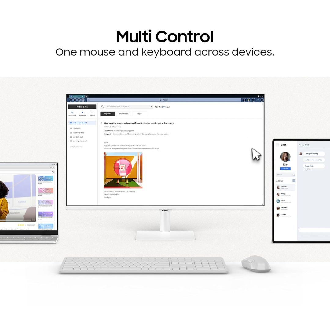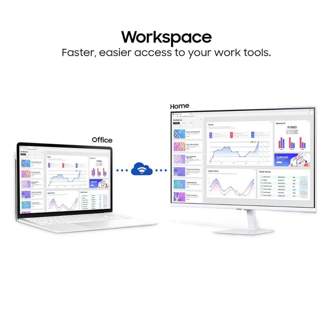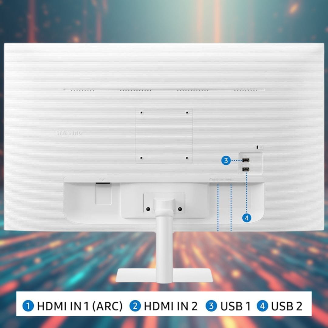 Equipped with built-in speakers, Wi-Fi, and Bluetooth, the monitor offers a clutter-free setup. The bezel-less white design adds elegance to any space, making the Samsung M5 Smart Monitor an ideal choice for home offices and entertainment rooms.