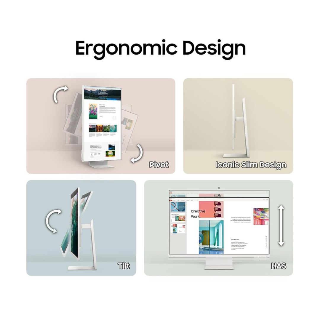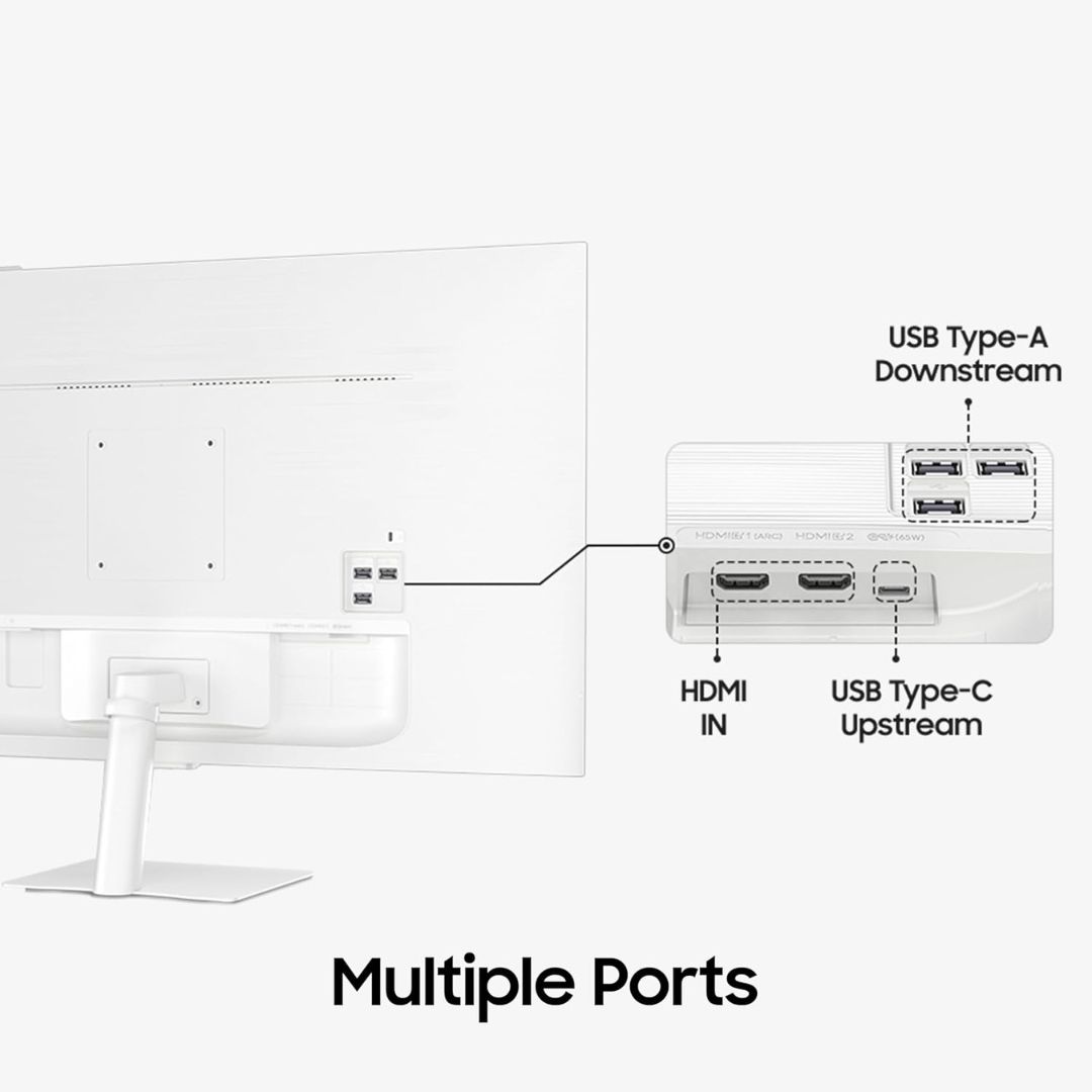 Finished in a clean white design, the Samsung M7 Smart Monitor is ideal for modern home offices and smart living spaces.