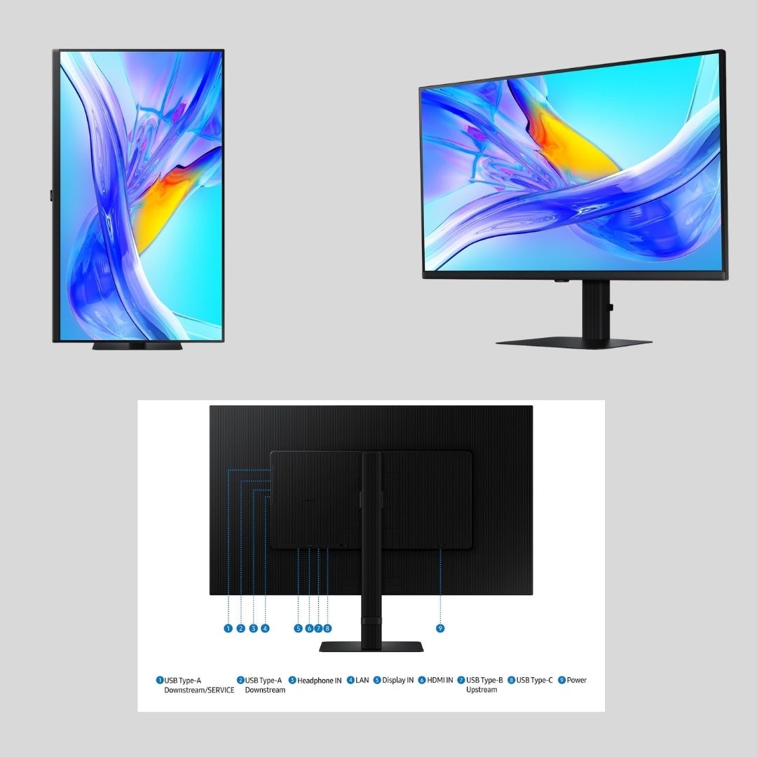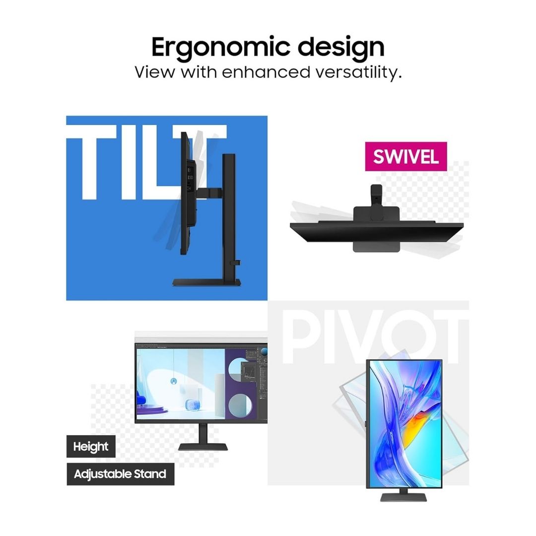 Designed for comfort, the Easy Setup Stand offers height adjustment and pivot functionality, helping you maintain an ergonomic posture during long work hours. Finished in a professional black design, the Samsung ViewFinity S8 is a powerful and elegant monitor for modern workspaces.