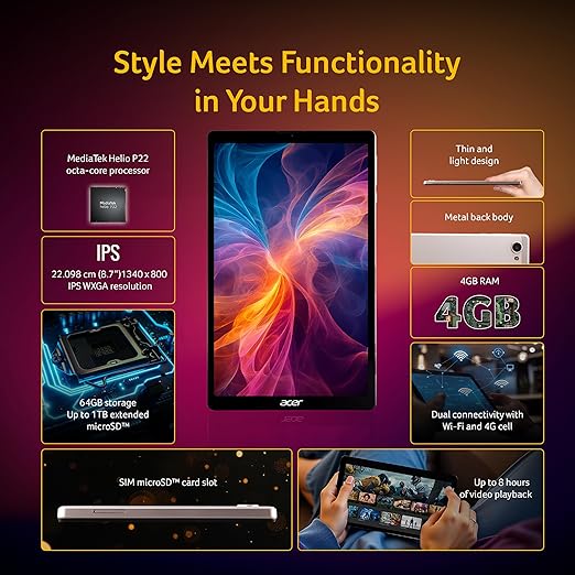 Acer Iconia Tab (iM9‑12M, ZT.T01SI.00D) is a compact, lightweight, and powerful Android 14-tablet designed for daily tasks, reading, and entertainment. The 8.7″ IPS display provides a comfortable view for all your content, while the Helio MT8768T processor delivers smooth performance for all your apps. With 4 GB of RAM and 64 GB of storage, plus expansion options, you'll have space for photos, games, and documents. The rear 5 MP and selfie 8 MP cameras allow for clear snapshots and video calls. It comes bundled with a protective flip cover for added peace of mind.