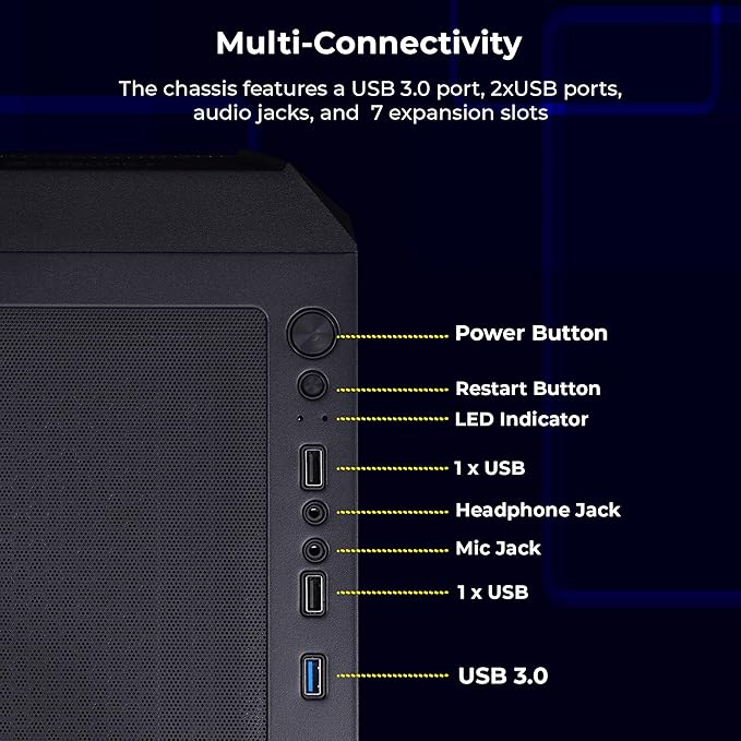 For convenience, the cabinet is equipped with USB 3.0, USB 2.0, audio & mic ports, ensuring fast connectivity. The magnetic dust filters help maintain a clean build and efficient airflow, while the dual-chamber design keeps cables neatly managed for a clutter-free look.