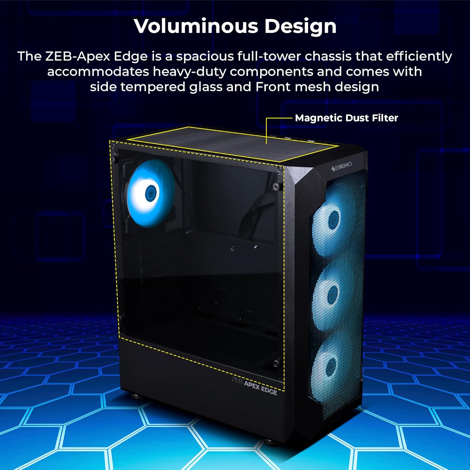 The Zebronics APEX Edge Premium Mesh Full-Tower Gaming Cabinet is designed for gamers who demand performance, airflow, and style in one powerful package. Built with a high-airflow mesh front panel, this case ensures optimal cooling even during long gaming sessions. It comes pre-installed with 4 Inner Glow ARGB fans, offering vibrant lighting effects and excellent heat dissipation right out of the box.