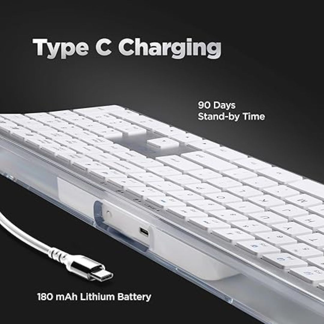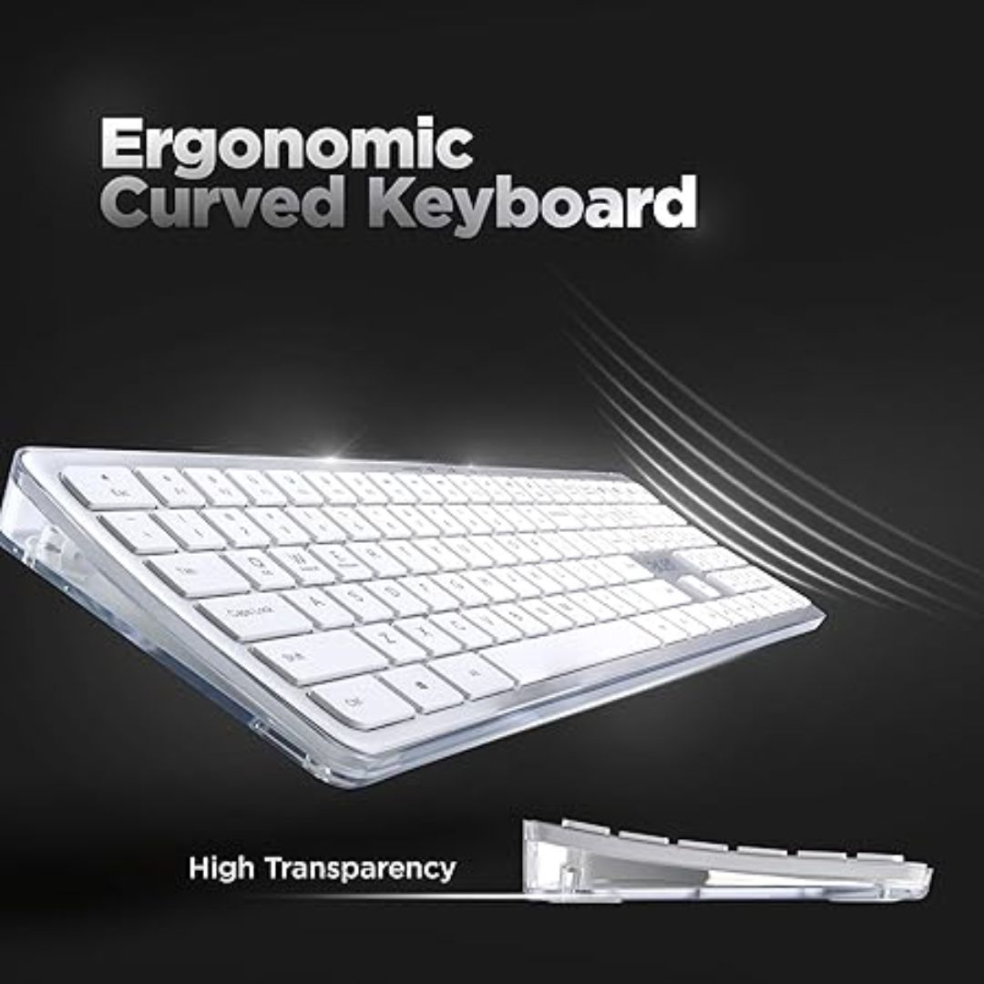 Its transparent curved design not only looks modern but also offers ergonomic comfort for long typing sessions. The rechargeable USB-C battery ensures eco-friendly usage without the hassle of replacing batteries.