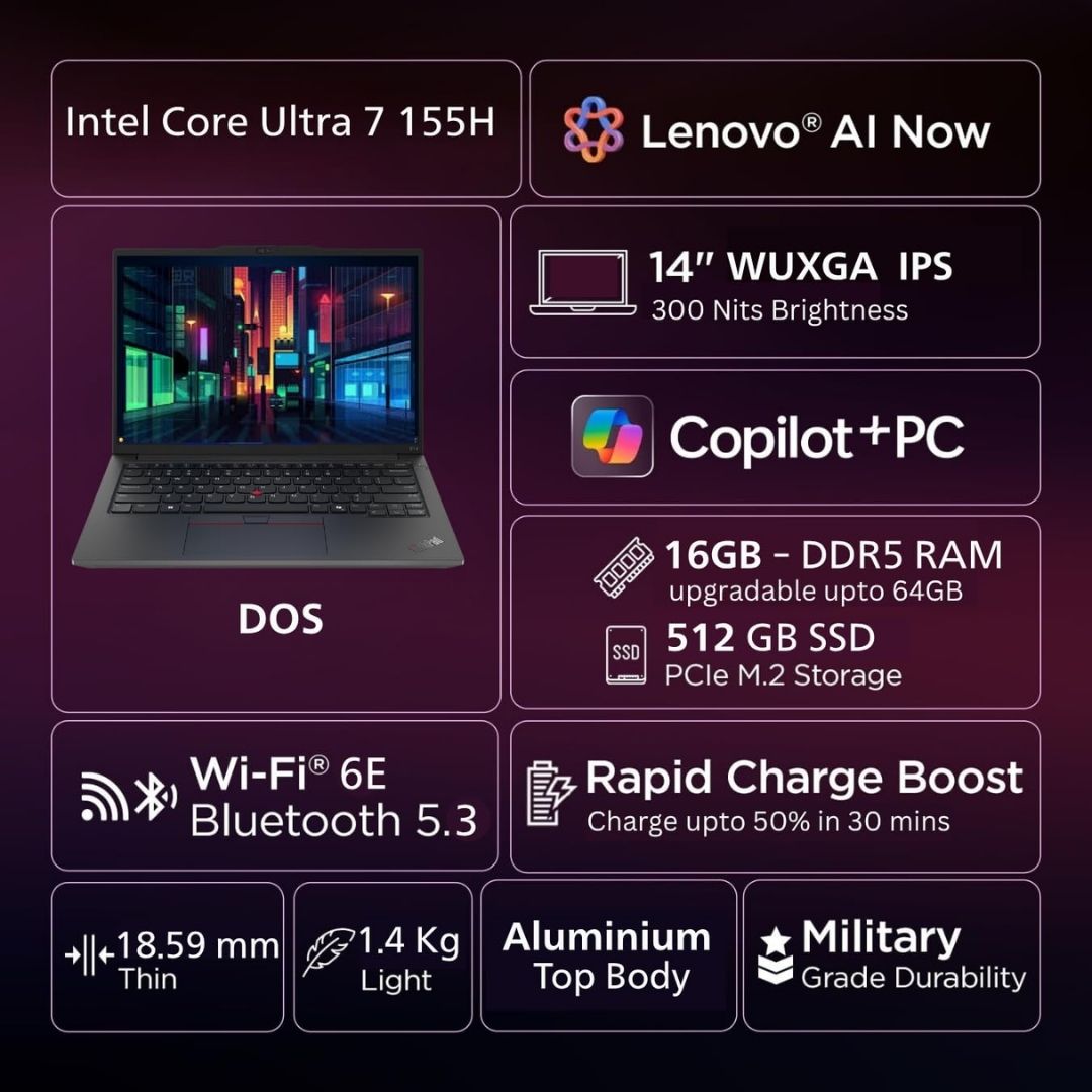 The Lenovo ThinkPad E14 (21M70098IG) is a premium thin-and-light business laptop designed for professionals seeking a blend of power, durability, and modern features. Powered by the Intel Core Ultra 7 155H processor, it integrates AI-driven performance with efficient multitasking capabilities. Its 14-inch WUXGA IPS display delivers superior brightness and clarity for productivity and entertainment. With 16GB LPDDR5x RAM, 512GB PCIe SSD, and Intel Arc Graphics, users experience seamless workflows and faster response times.