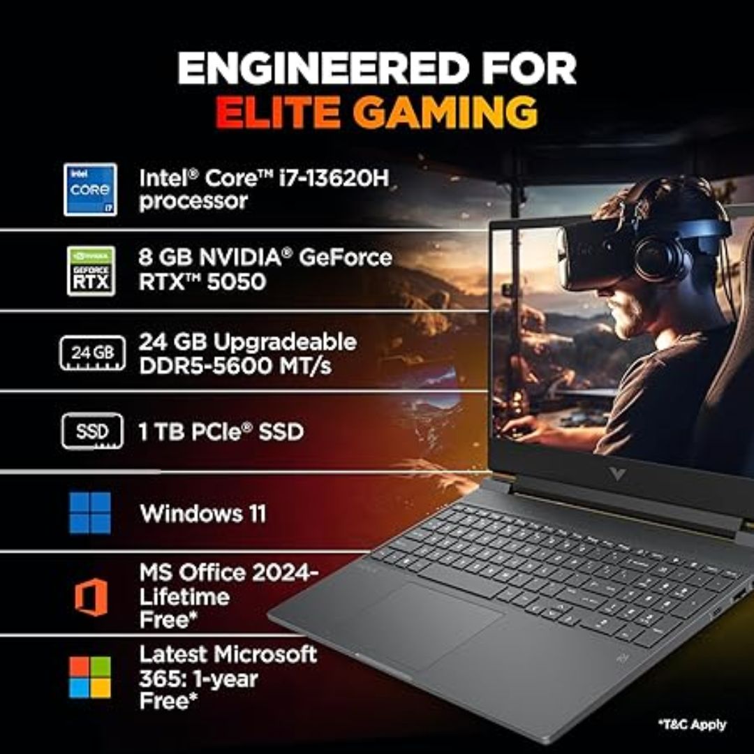 HP Victus 15-fa2309TX Gaming Laptop is designed to power your games and productivity with its 13th Gen Intel Core i7-13620H processor and NVIDIA GeForce RTX 2050 GPU. With 8GB DDR5 RAM (expandable up to 24GB) and a 1TB NVMe SSD, it offers smooth multitasking, ultra-fast boot times, and plenty of storage for games, work, and entertainment.