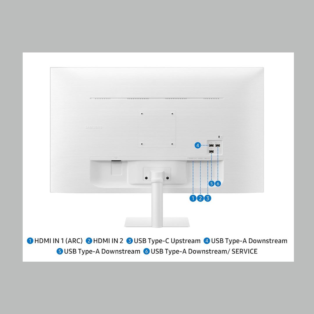 Finished in an elegant white design, the Samsung M7 Smart Monitor is ideal for modern homes and smart workspaces.