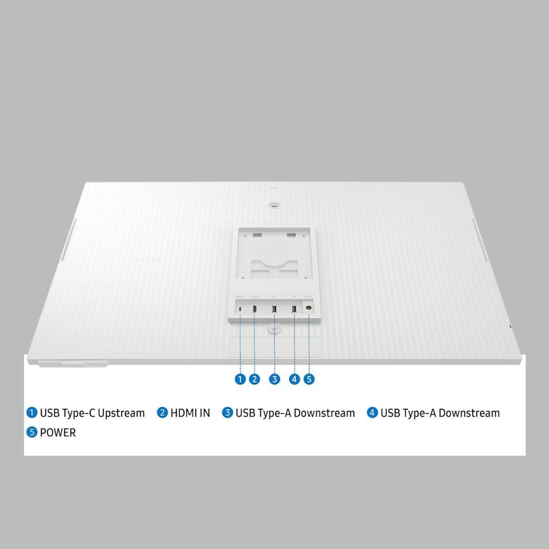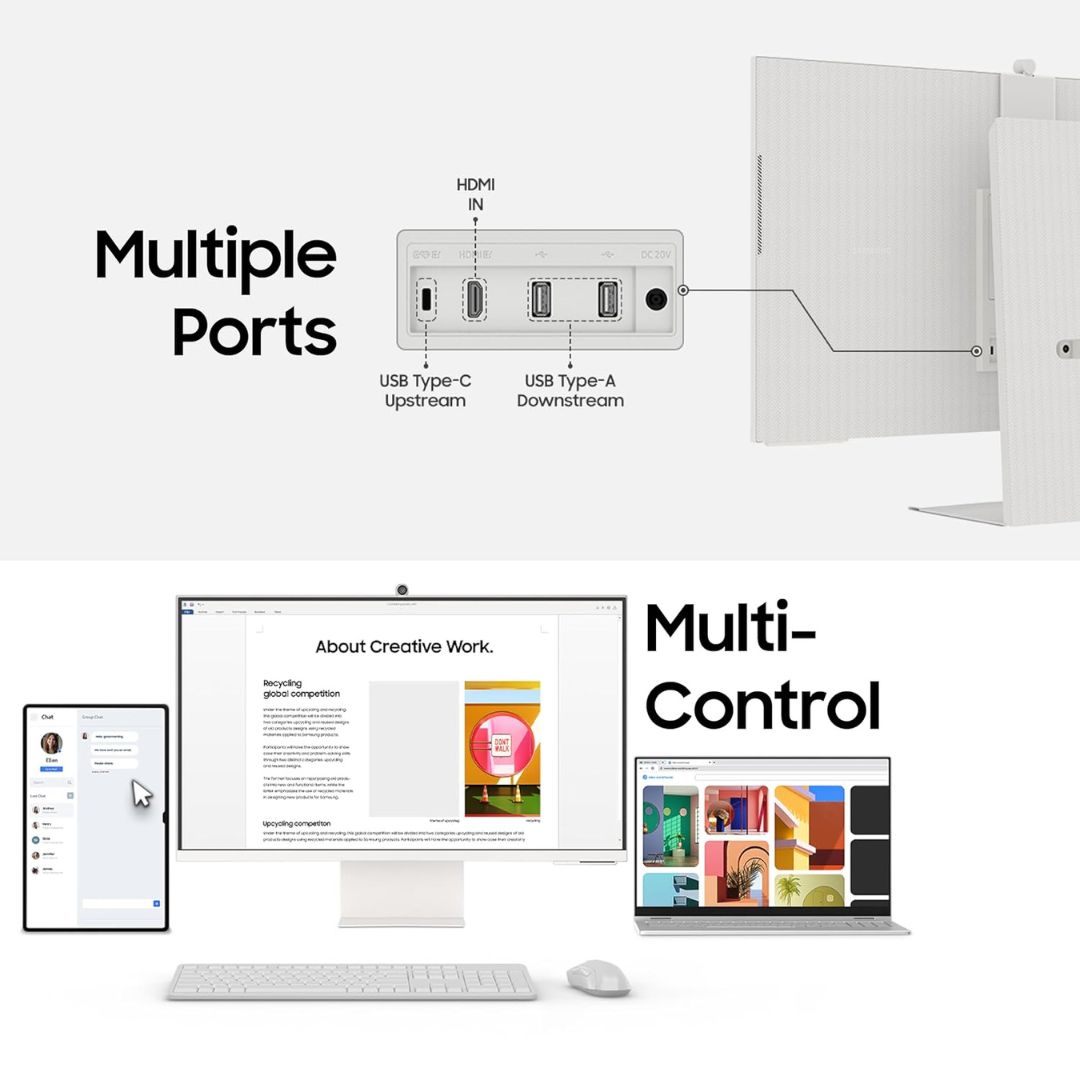 Finished in an elegant white design, the Samsung M8 Smart Monitor is perfect for modern home offices and entertainment spaces.