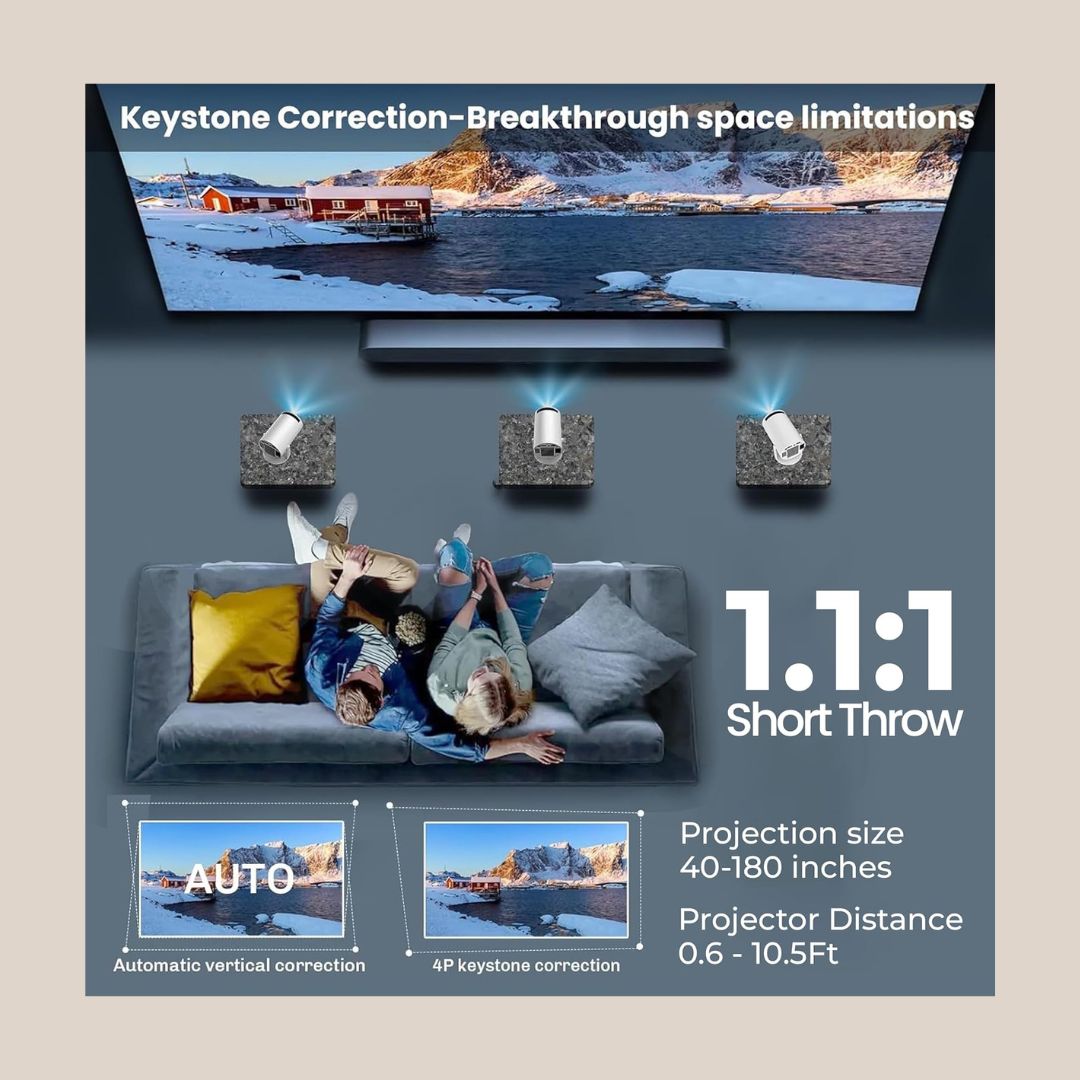 Equipped with an Android smart platform, the Atom 2X allows direct access to popular streaming apps like Netflix and Prime Video without the need for external devices. Automatic and 4D keystone correction ensures quick and hassle-free alignment, while built-in WiFi, Bluetooth, and screen mirroring provide flexible connectivity options. With 1GB RAM and 8GB internal storage, this projector is a convenient all-in-one solution for everyday entertainment.