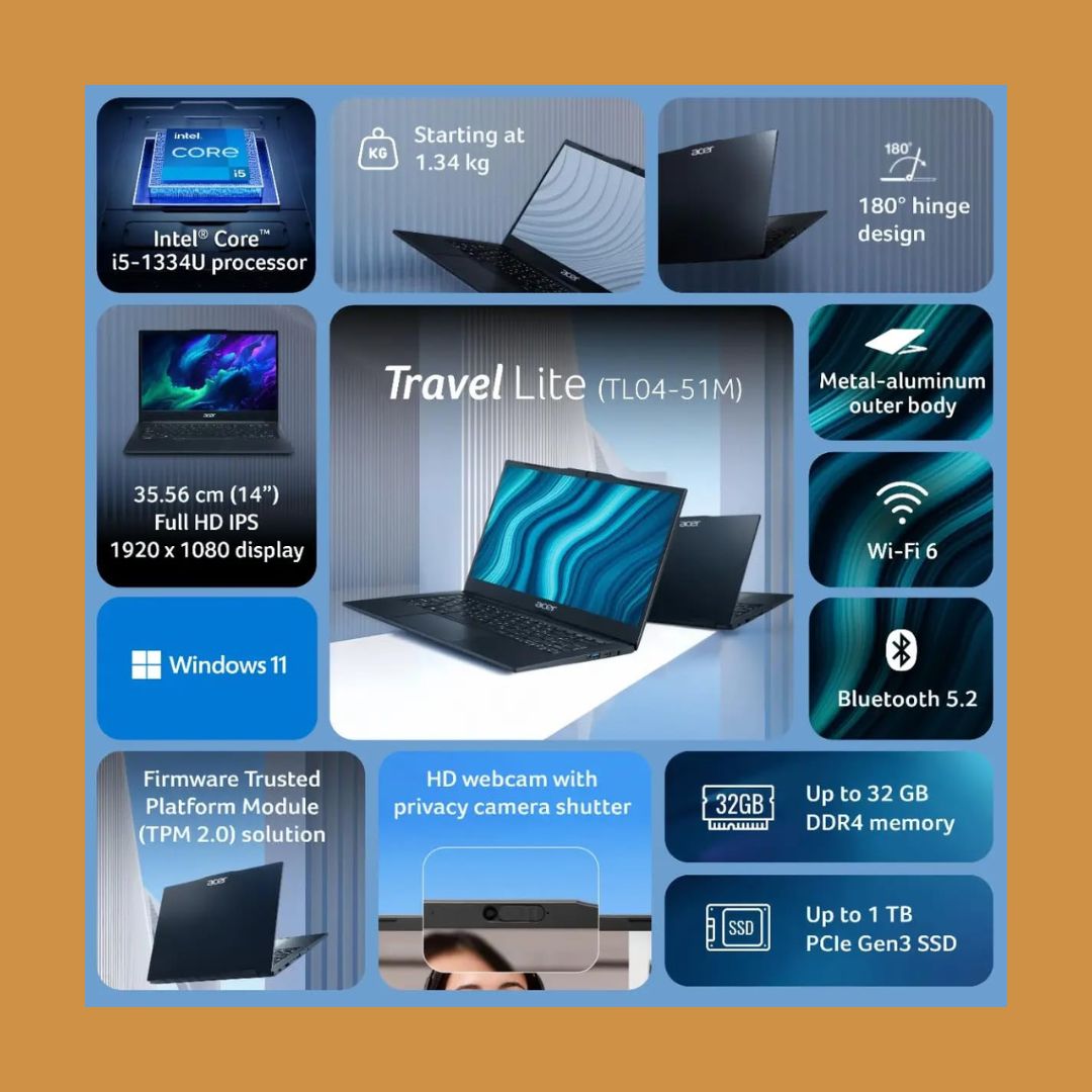 The Acer TravelLite Smart FHD TL04-51M (UN.36JSI.002) Laptop is built for professionals who need reliable performance, portability, and long-term durability. Powered by the 13th Gen Intel Core i5-1334U processor with 8 cores, it delivers efficient multitasking and smooth performance for office work, business applications, and daily productivity.