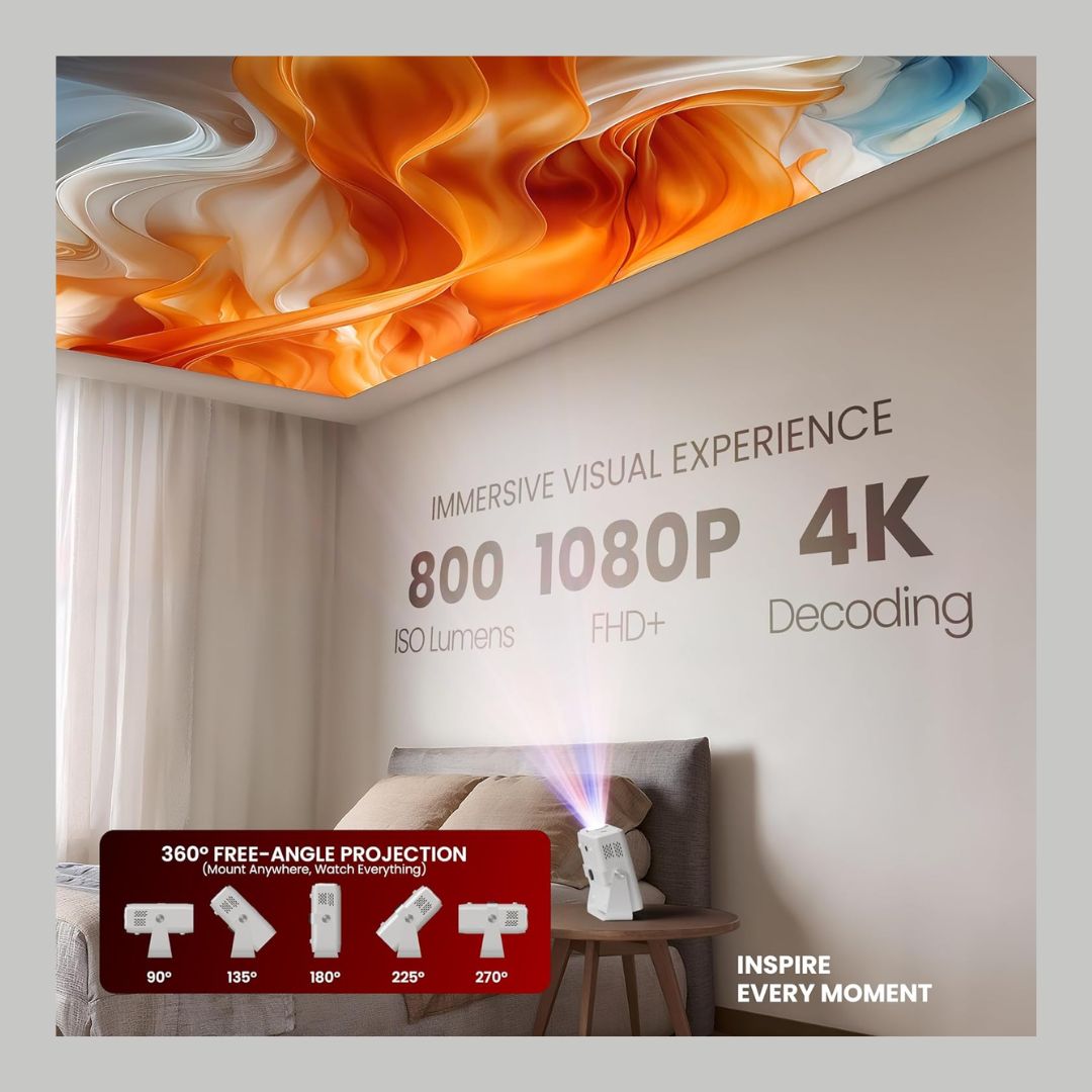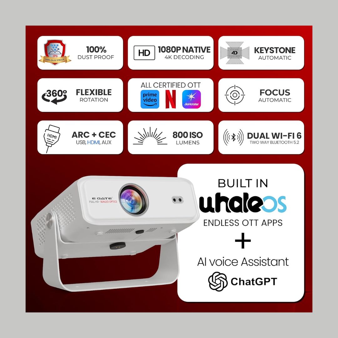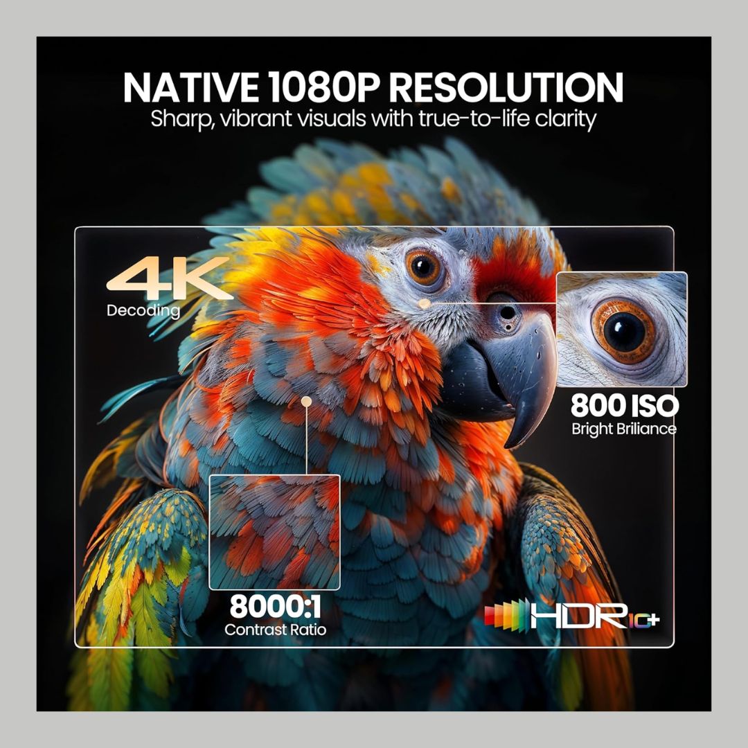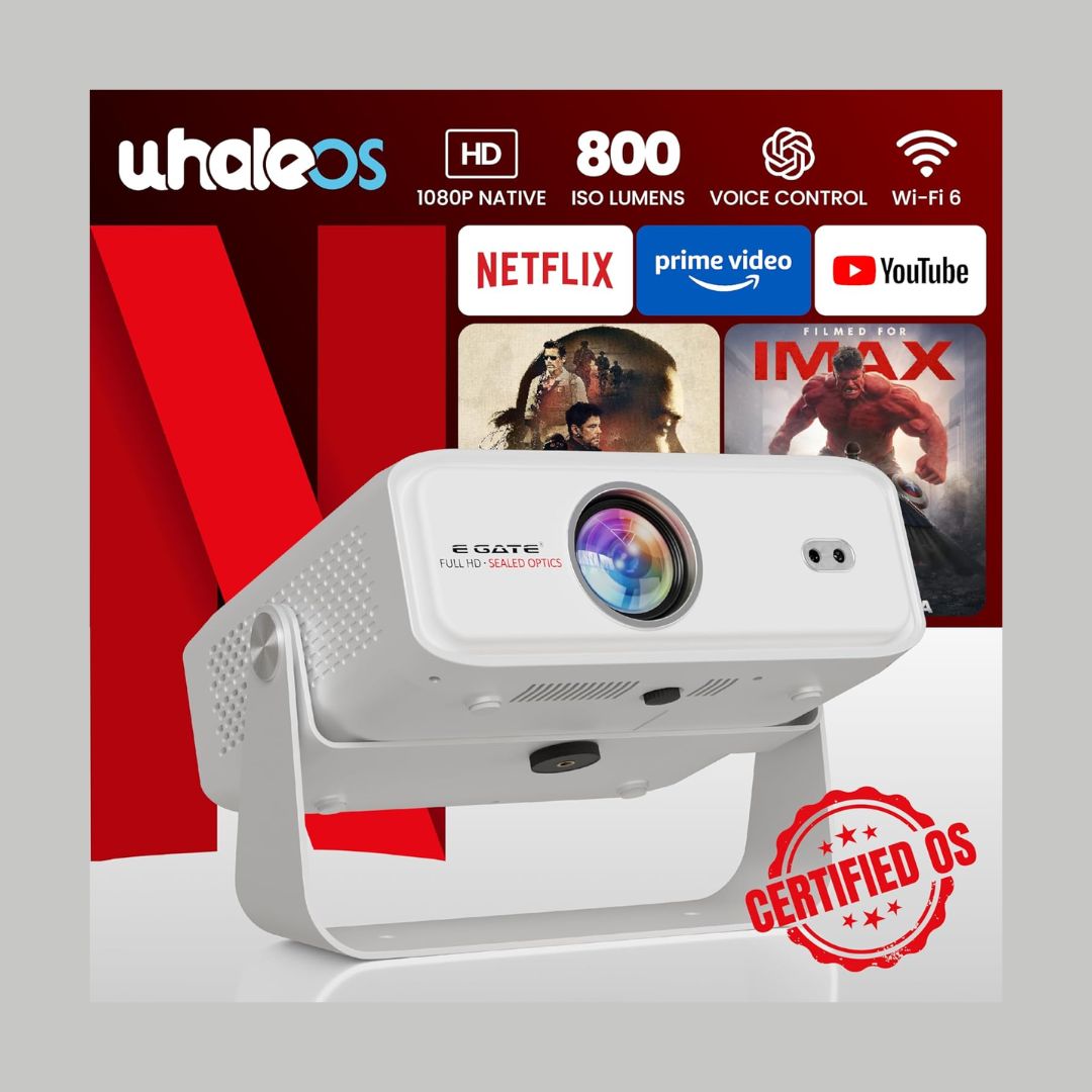 Powered by Whale OS on Android, the projector comes with 100% certified Netflix and Amazon Prime Video, allowing you to stream directly without any additional devices. The 800 ISO brightness ensures excellent clarity even in ambient room lighting, while the 100% dust-free sealed optical engine guarantees long-lasting performance and image consistency.