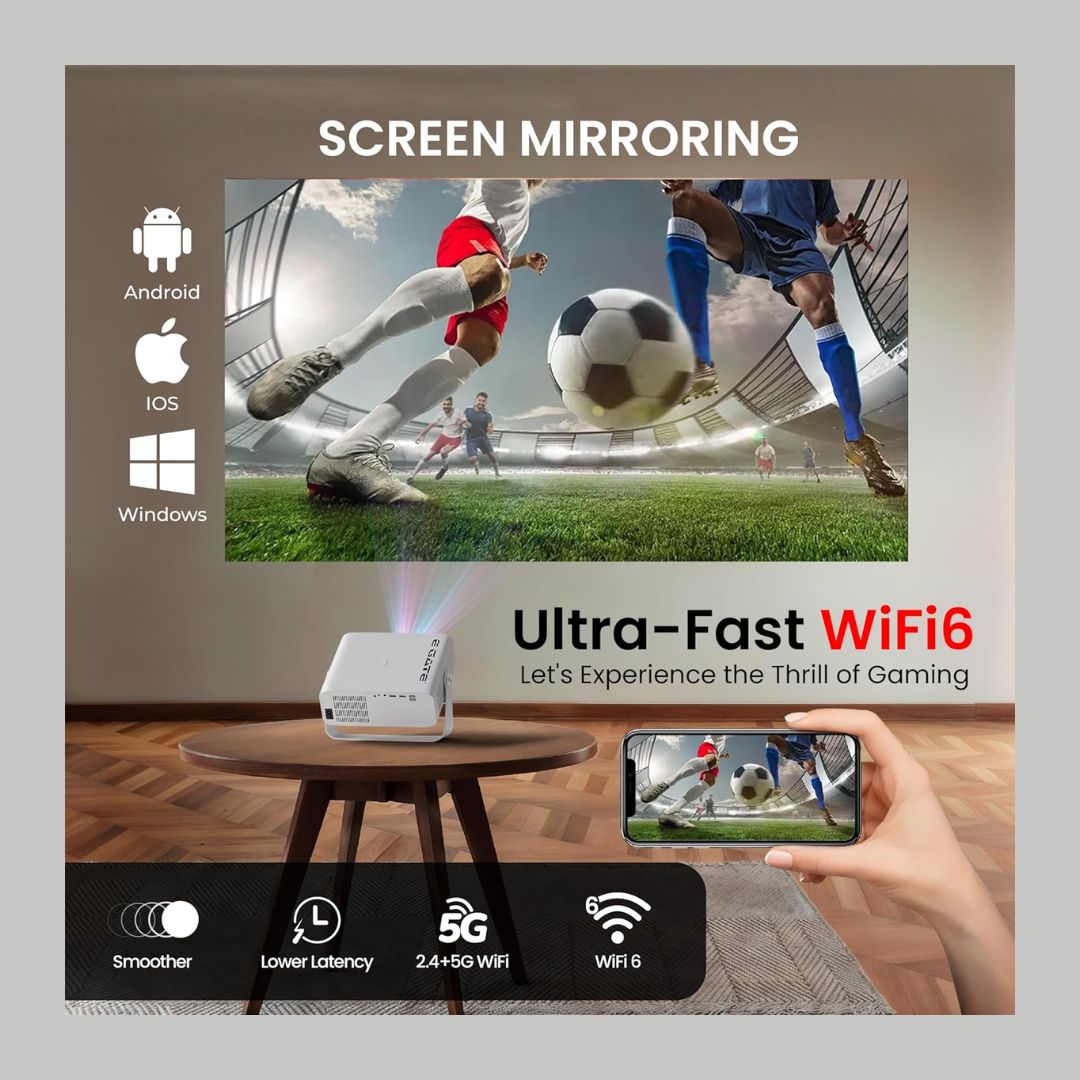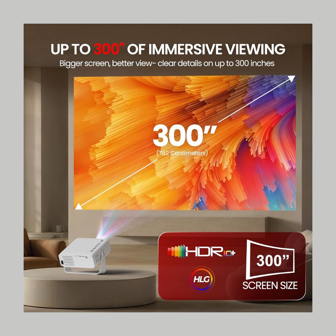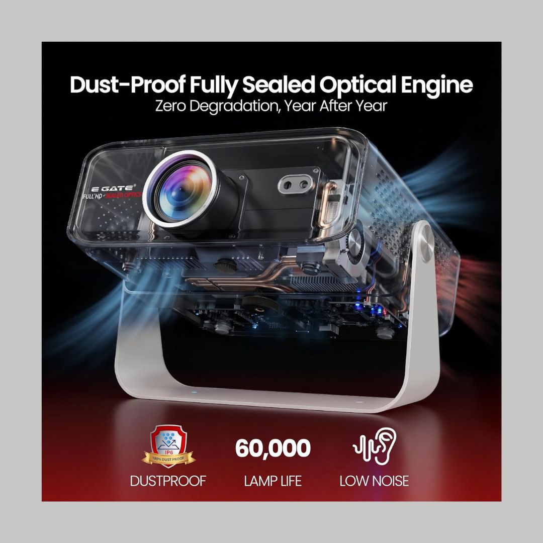 The E Gate Duster 8X Fully Automatic Smart Projector is designed to transform your room into a complete home cinema. With native 1080p Full HD resolution and support for 4K Ultra HD content, it delivers sharp, vibrant, and immersive visuals for movies, sports, gaming, and OTT streaming.