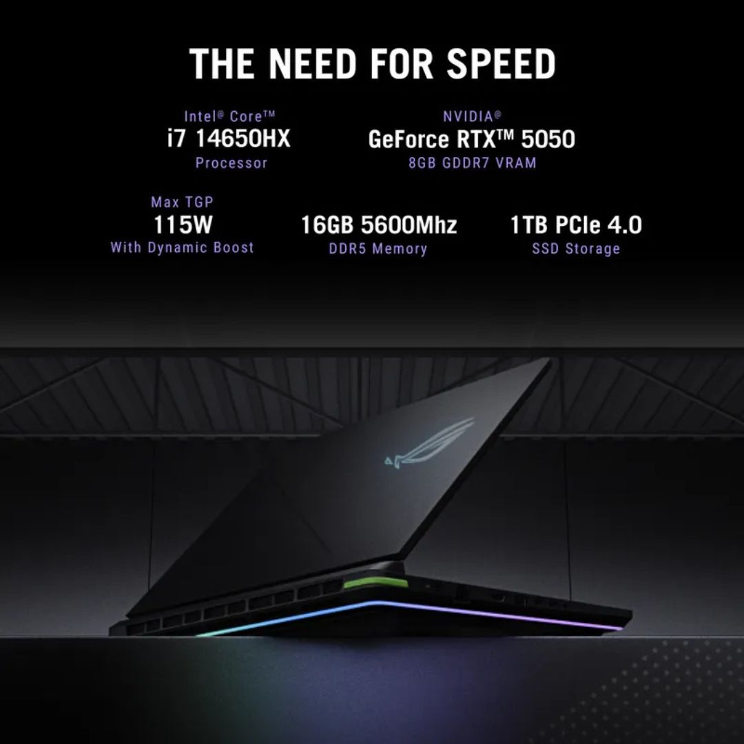 The ASUS ROG Strix G16 combines cutting-edge power with ROG’s signature gaming DNA. Powered by the Intel Core i7-14650HX processor and NVIDIA GeForce RTX 5050 (8GB) graphics, this laptop delivers top-tier performance for gamers and creators alike.