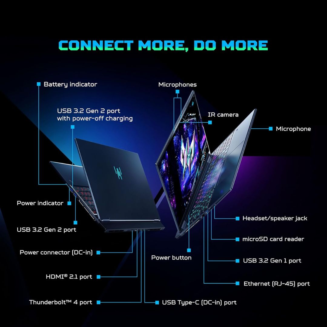 Crafted in a sleek Abyssal Black design and weighing just 2.3 kg, the Helios Neo 16S combines portability with raw power. The RGB backlit keyboard and AI-enhanced features make it the ultimate choice for competitive gaming and professional workloads.