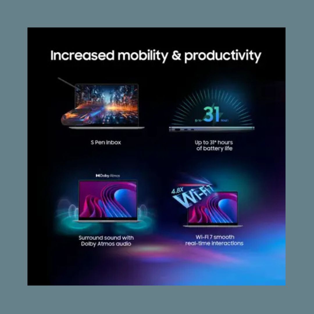 Its 15.6-inch AMOLED touchscreen delivers stunning visuals with deep blacks and rich colors, making it ideal for creative tasks, presentations, and entertainment. The 360-degree hinge allows seamless switching between laptop and tablet modes, while S Pen support enhances precision for note-taking and design work. Crafted with a sleek metal body and weighing just 1.48 kg, it combines portability with durability. Features such as a backlit keyboard, fingerprint reader, Windows 11 Home, and MS Office make it a complete high-end productivity solution.