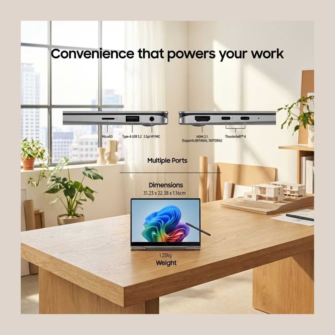 Its large 16-inch AMOLED touchscreen delivers stunning visuals with deep blacks and vibrant colors, ideal for creative work, presentations, and entertainment. The 360-degree convertible hinge allows flexible use in laptop, tablet, and presentation modes, while S Pen support enhances precision for note-taking and design tasks. Built with a premium metal body and weighing just 1. 66 kg, it balances durability with portability. Features like a backlit keyboard, fingerprint reader, Windows 11 Home, and MS Office make it a complete productivity solution.