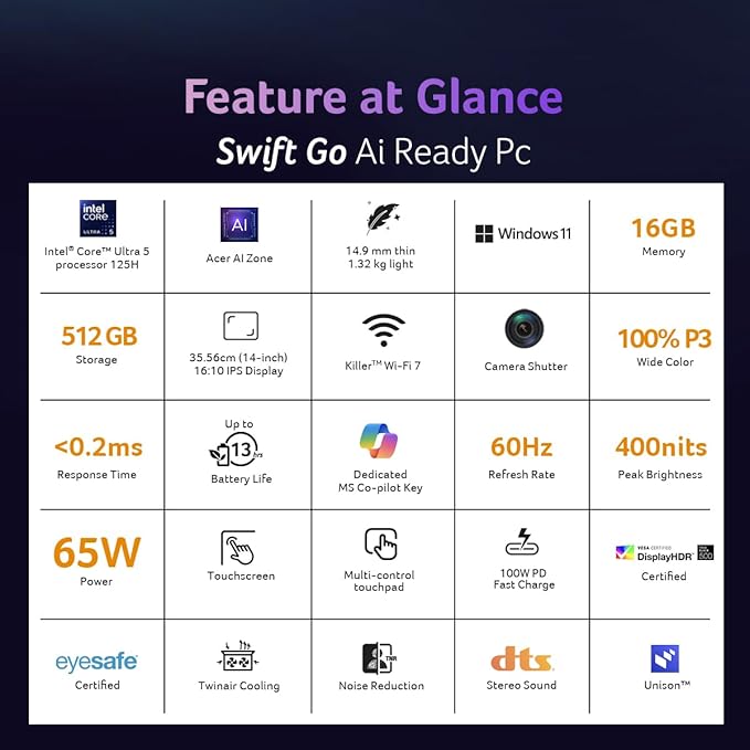 Acer Swift Go 14 (SFG14-73T) is a premium thin and light laptop built for modern professionals, students, and creators. Powered by the Intel Core Ultra 7-155H processor with Intel Arc Graphics, it ensures exceptional AI-optimized performance for productivity, content creation, and entertainment.