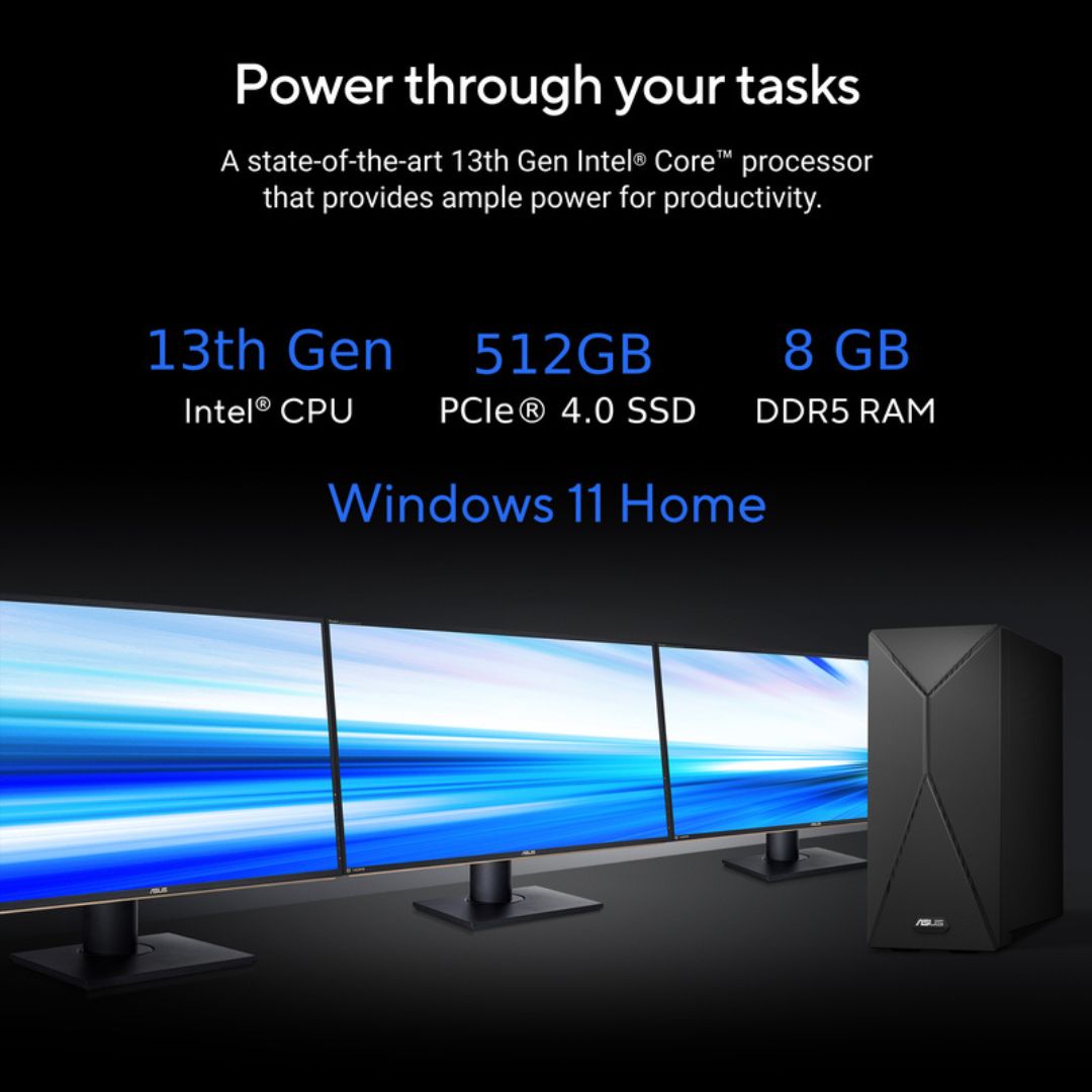 The ASUS S501MER Consumer Tower PC is designed for users seeking reliable, next-gen performance in a sleek and modern desktop. Powered by the 13th Gen Intel Core i3-13100 processor, this tower PC delivers responsive multitasking and efficient productivity, perfect for home, study, and office environments.